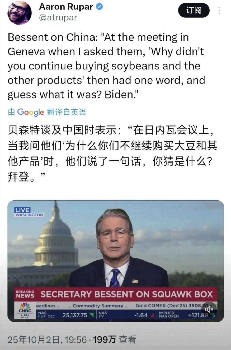 美国财长贝森特北京时间10月2日晚接受采访时表示:不幸的是,中国决定将美国大豆种