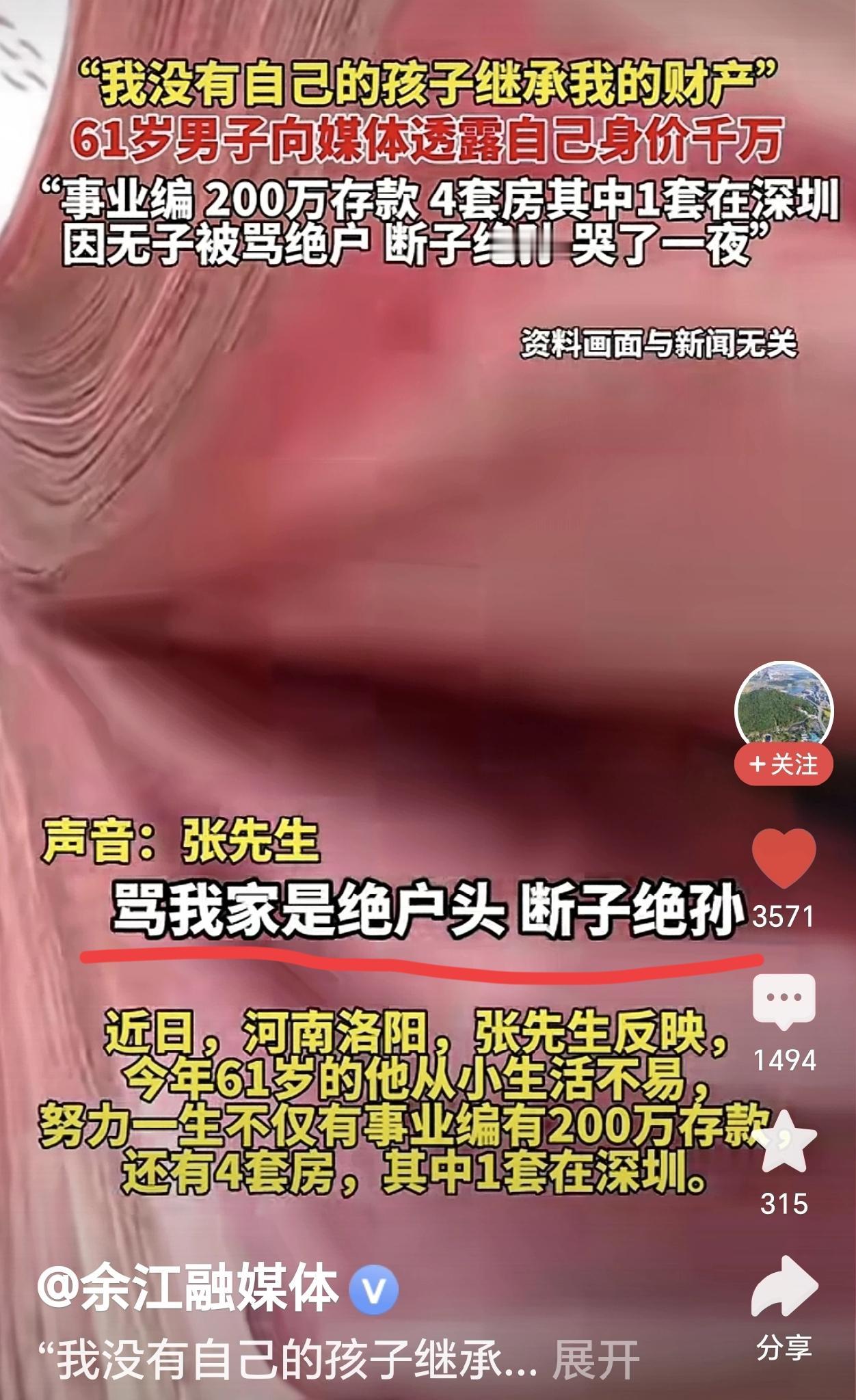 被骂断子绝孙,61岁男子哭了一夜。 人生的遗憾是守着金山银山而没有后人继承吗? 这位61岁男子有一段失败的婚姻,而后就没有再次成家。 这些年来,攒了200万元存款,4套房子,其中1套还在深圳,身价1000万以上了。 有人说男子后来为什么没有再次成婚,或许跟男子说的这句话有关系——男子声称在网上相亲还被骗了,坑太多。 人生本就无常,得到了这个,又失去那个,从一个角度看男子做到了人生赢家,别人从另一个角度看却一败涂地。 或许人生本就遗憾,对什么执着,什么事情就会折磨自己,不如放下,放过自己,享受当下。你说对吗?