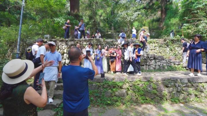 同时,“十一”期间景区还精心策划了“遇见呐!山山川川”主题活动,让游客的游玩体验再升级。核心节点处,身着襦裙、手持团扇的古风NPC沿古道巡游,与游客亲切互动、合影打卡,仿佛让人穿越时空;同步上演的“森林疗音会”上,工作人员敲打手碟发出的空灵乐声,与山间鸟鸣、风声交织,营造出“天人合一”的治愈意境,将节日氛围推向高潮。