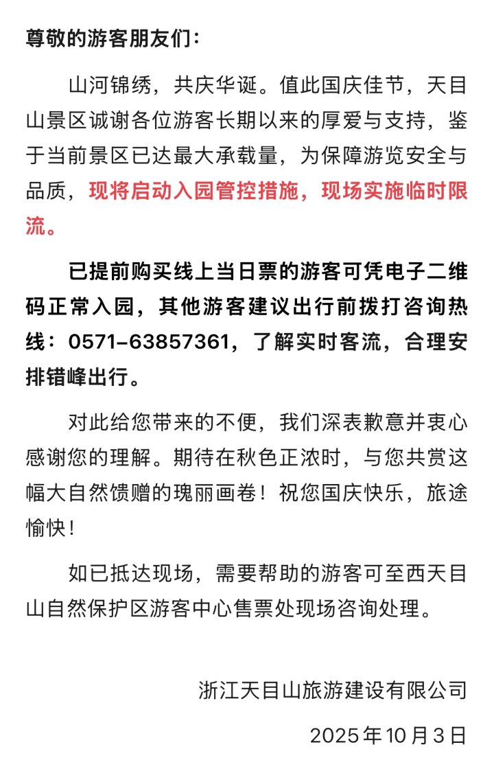 今天下午,一则《关于10月3日天目山景区游客限流公告》在临安人的朋友圈炸了锅,许多当地人表示活了那么久,第一次看到天目山限流!