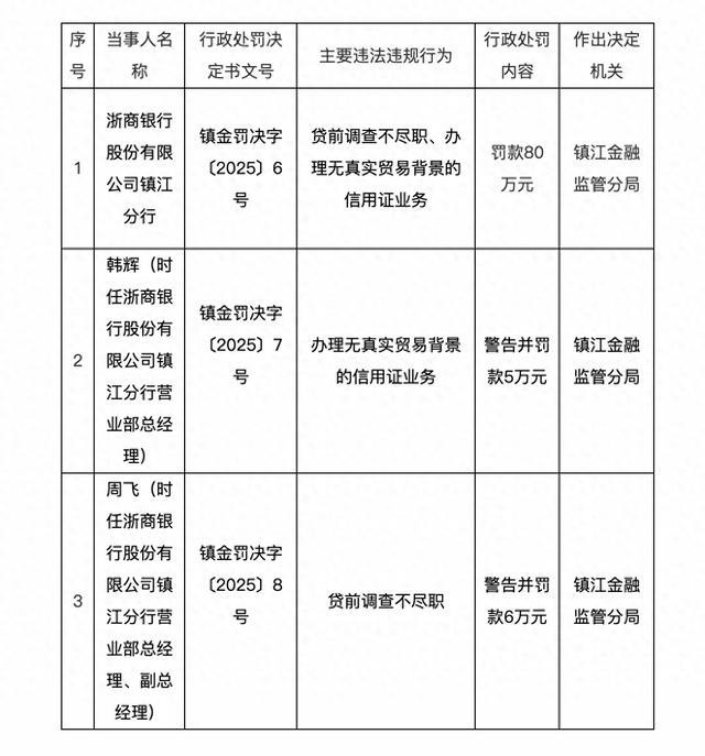 根据行政处罚决定书(镇金罚决字〔2025〕6号),浙商银行股份有限公司镇江分行存在以下主要违法违规行为:“贷前调查不尽职”与“办理无真实贸易背景的信用证业务”。镇江监管分局依法对该分行作出罚款80万元的严厉处罚。