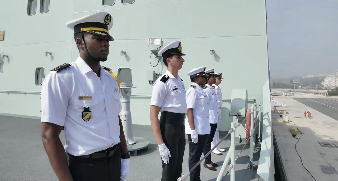 第一个是黑人,第二个是白人,第三个是黑人,第四个是黑人,第五个是白人。 猜猜,这是哪一艘舰? 是美国的阿利伯克,还是朱姆沃尔特,或者是提康德罗加? 答案是,都不是。 仔细看图二中的那几个字。 第一眼就是,不是英文,而是中文。 第二眼认真看,隐约还是能够看到的,戚继光舰。 这就对了,戚继光舰就是一艘训练舰。