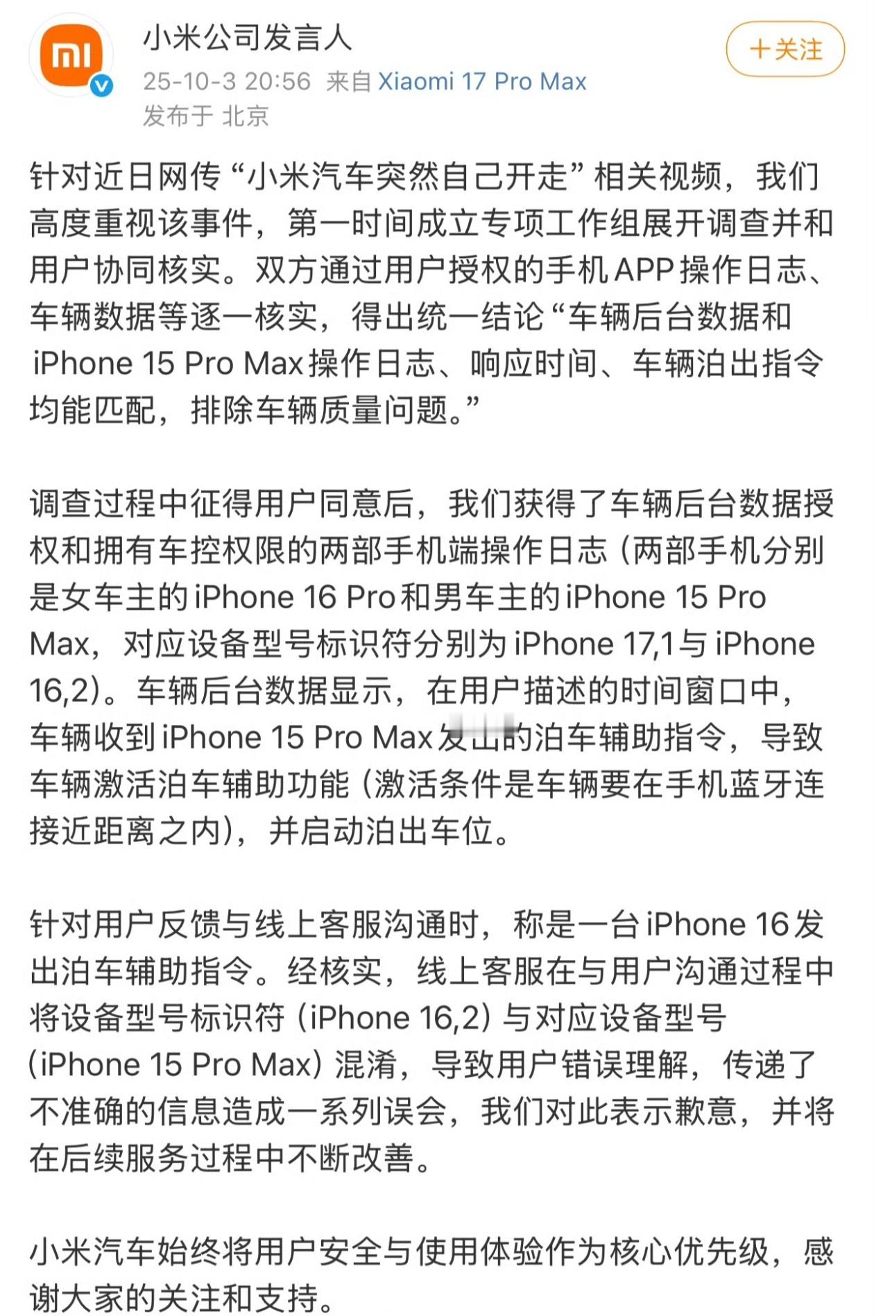 小米汽车自己开走事件的当事车主本人也承认是触发了遥控泊车[摊手]