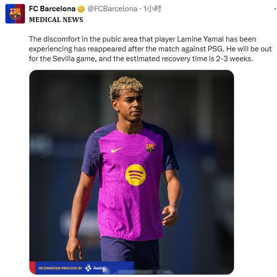 巴萨官方宣布,18岁西班牙国脚亚马尔,在周中对阵巴黎的欧冠比赛后,再次出现耻骨区域不适症状,他将缺阵本周末对阵塞维利亚的西甲比赛,预计伤情恢复需要2到3周时间。