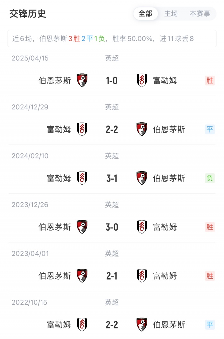 伯恩茅斯联赛3胜2平1负积11分暂位英超第6,近2轮不胜;富勒姆2胜2平2负积8分暂位英超第11,上轮客场1-3不敌维拉。