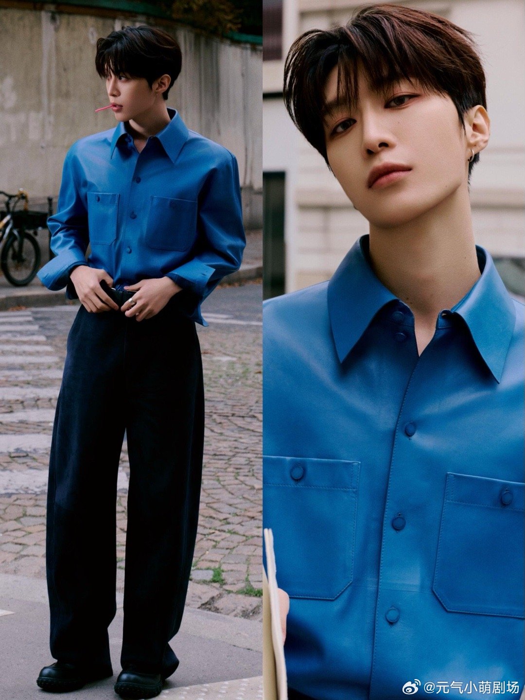 范丞丞身穿Givenchy蓝色衬衫搭配深蓝色长裤