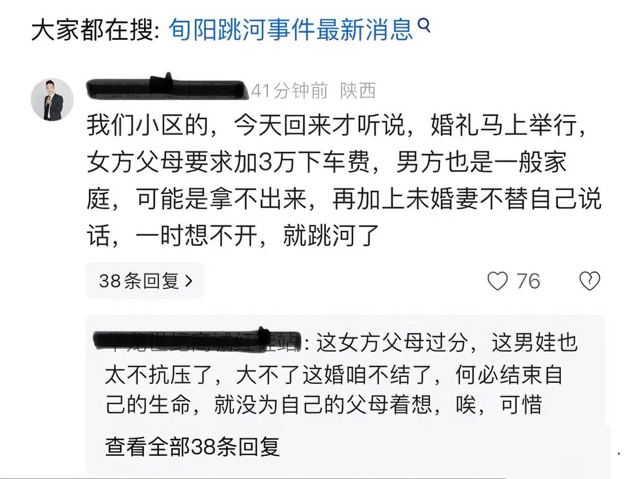 3号刚参加完婚礼,转头就见陕西新郎跳河!3万彩礼,真要了命? 谁能想到啊,我3号刚去参加完朋友的婚礼,看着他和新娘笑盈盈拜堂,转头就刷到陕西旬阳的婚礼惨剧。新郎居然为了3万临时加的下车费,跳了旬阳大桥! 那天中午11点多,大桥边围了好多人,河里因为连雨天涨得浑浊,新郎跳下去扑腾几下就没影了,搜救到现在都不顺利。知情人一说内情,我心都揪紧了:迎亲都到跟前了,新娘父母突然说要加3万下车费,不然不让新娘下车。新郎家本就是普通家庭,结婚前彩礼、酒席已经花得差不多了,哪拿得出这临时的钱?更让人心寒的是,新娘居然没帮着说一句情,就眼睁睁看着新郎被逼到绝路。 这样的女人,以后谁还敢娶,简直就是催命鬼…… 别拿“传统习俗”当遮羞布了,这哪是习俗?分明是趁喜打劫!3万可能不算天文数字,但压垮新郎的,是“都要结婚了还被这么拿捏”的绝望。是之前为结婚掏空的积蓄,是当下被卡住脖子的无助,更是新娘那句沉默的“不帮你”。 要是新郎真的没了,新娘一家这辈子能心安吗?嫁女儿不是卖女儿,临时加价不是“考验”,是催命!现在谁结婚不花钱,但得花在明处、花在愿意上,不是像这样攥着“不下车”的把柄硬要。真怕再出这样的事,要是连结婚都得赌上命,这样的“喜事”,谁还敢盼啊?