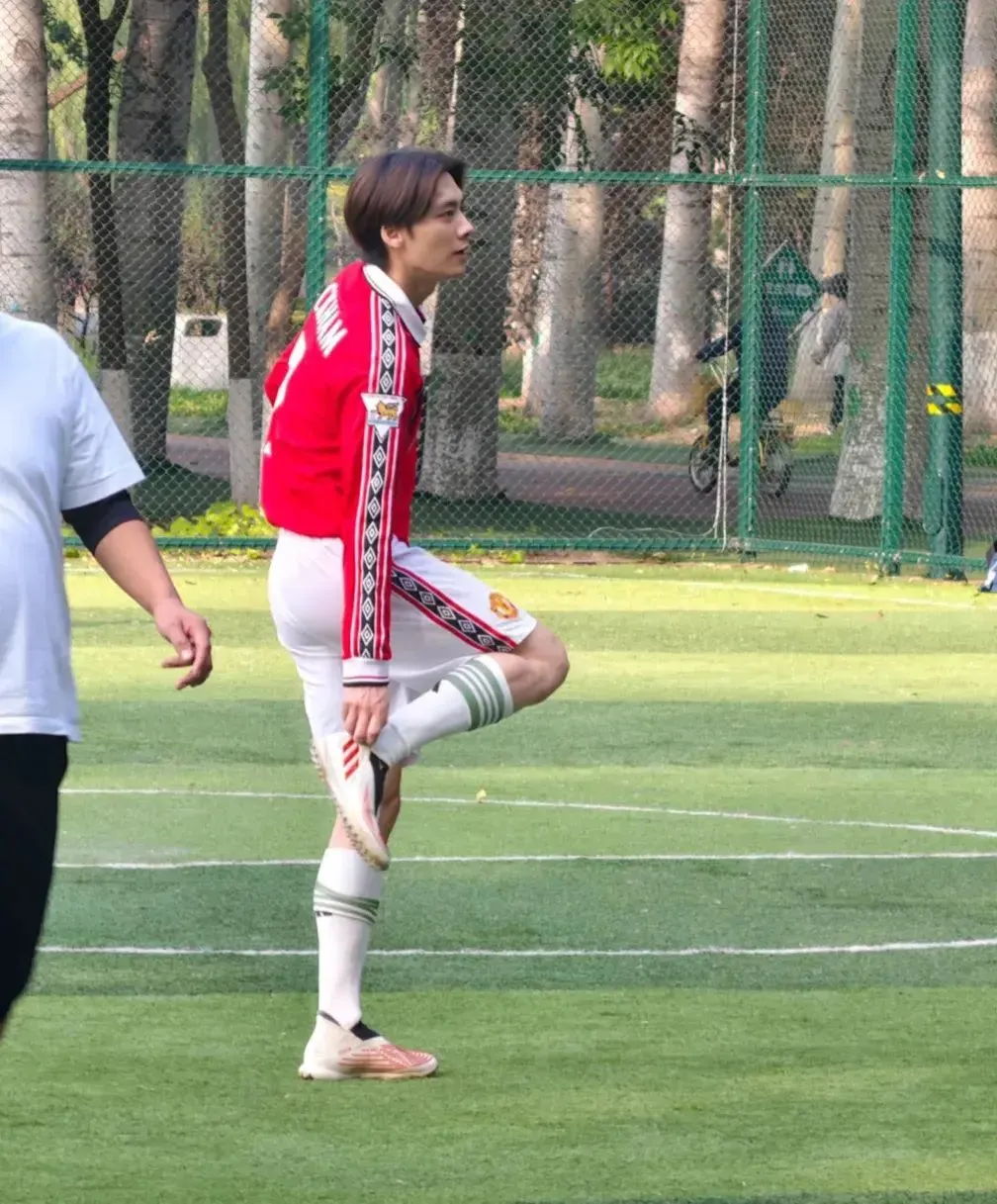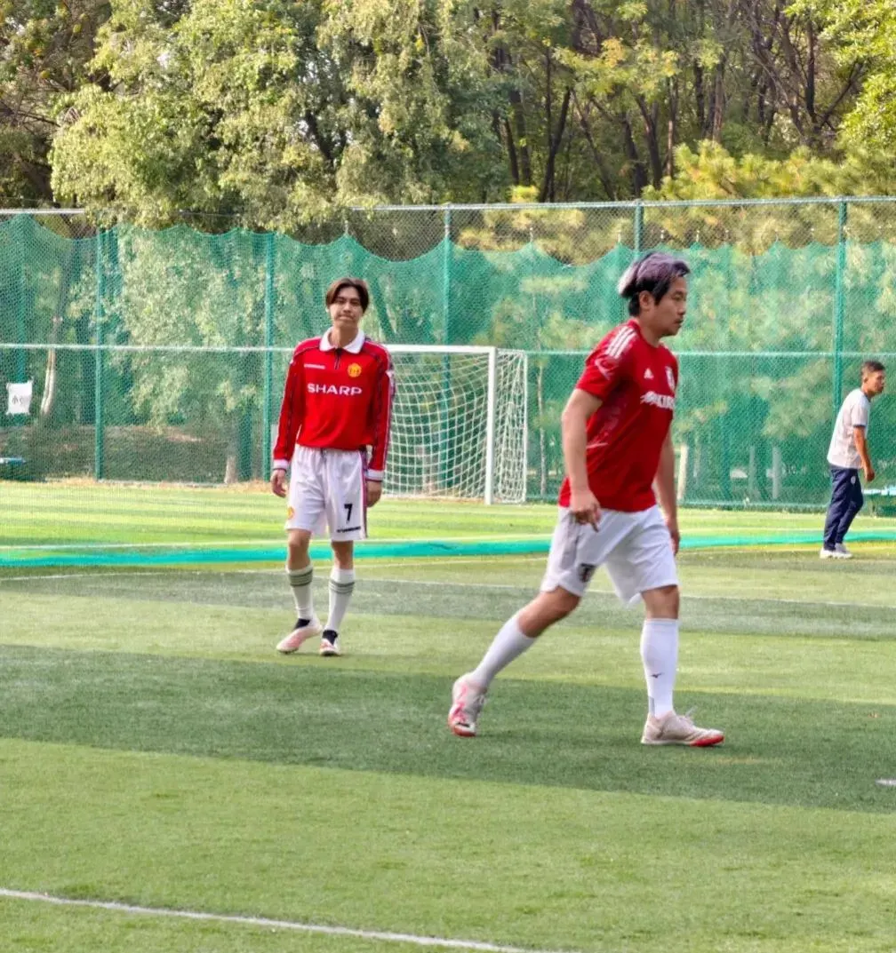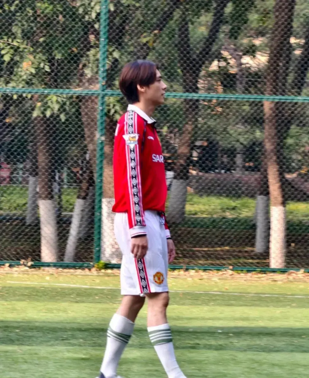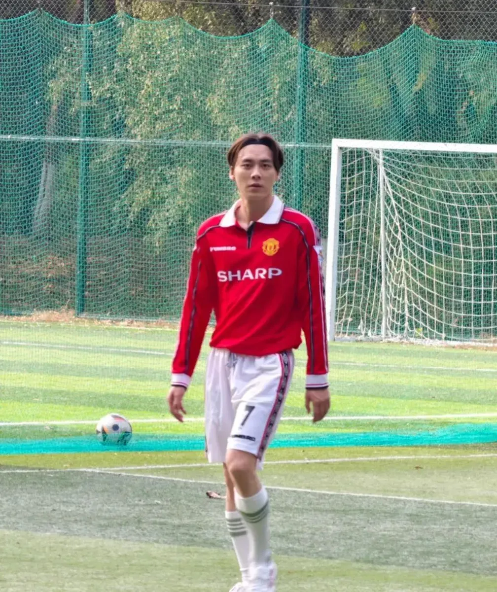 他穿着足球服套装,从身形看,但是没有发福的迹象,看来依然有在做身材管理。