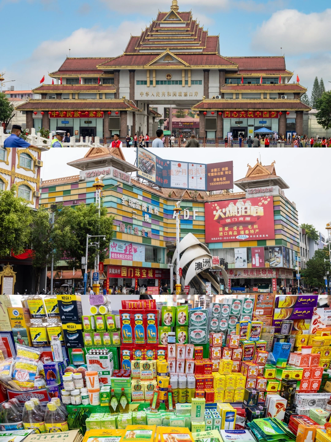 游客来到德宏必打卡,广场上又恢复了一派热闹景象,商人本地人聚集于此,游客在这里成群结队与国门合影拍照。买东南亚的东西真便宜!