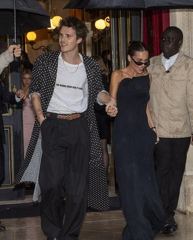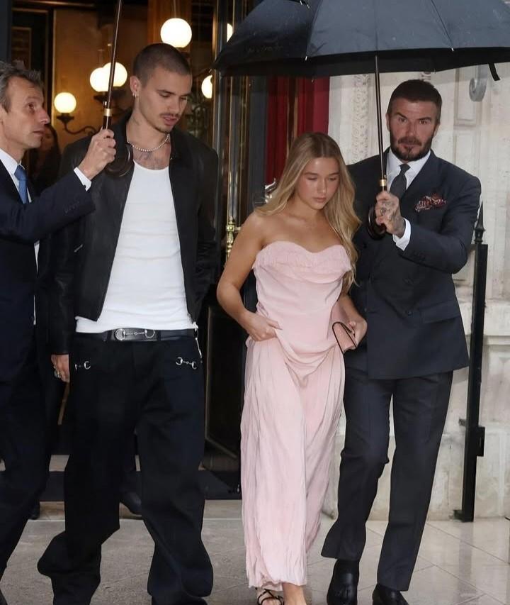14岁的小七穿低胸装参加妈妈的巴黎时装秀。 贝克汉姆贴心为女儿撑伞。 罗密欧身着机车夹克配喇叭裤,与妹妹相视一笑感情好。 克鲁兹则和女友杰姬·阿波斯特尔笑容满面同行。