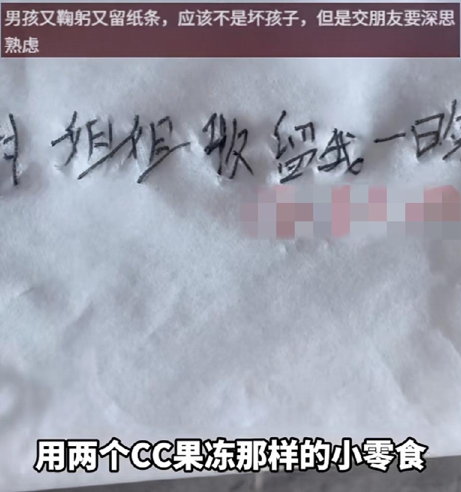 10月3日,湖南怀化一男孩与朋友相约一起玩,朋友中途被家长带走!男孩孤身在外无处可去,好心女子收留男孩住宿! 据悉,男孩是从湖南怀化出发到火马冲找朋友玩。结果深夜朋友的父母将朋友接走了,留下了男孩独自一人在陌生的地方,不知道该去哪里。 凌晨两点左右男孩看到一家酒店,徘徊了许久,最终鼓起勇气走进酒店,向老板娘说明了情况。 善良的老板娘表示可以让男孩在此借宿一晚,考虑到秋天蚊子又多又毒,还贴心地为男孩点上了蚊香,并为男孩拿来了风扇。 为了不让男孩觉得尴尬,老板娘简单安排好就关灯离开了,第二天老板娘发现男孩早早的就离开了。在一截卫生纸上留下字迹:谢谢大姐姐收留我一晚! 为了防止卫生纸被吹走,男孩还留下了一个果冻将纸压住。老板娘查看监控,发现男孩特别懂事,特意换了新的袜子才躺到沙发上睡觉,临走前还对着监控对老板娘深深鞠了一躬。 老板娘的眼睛湿润了,因为男孩的懂事和感恩之心,令人动容。虽然只是一次短暂的相遇,但老板娘的善举,和懂得感恩的男孩,为这个萧瑟的秋天增添了一丝温暖! 善良