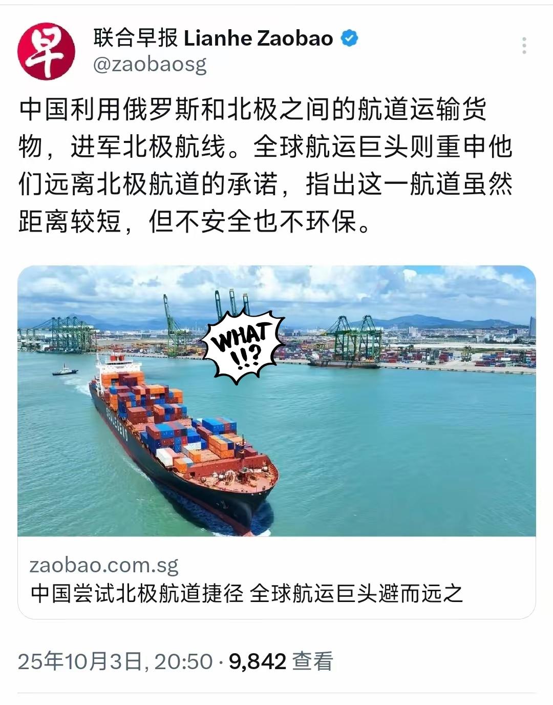 新加坡联合早报今晚(10月3日晚)写道:“中国利用俄罗斯和北极之间的航道运输货物,进军北极航线。全球航运巨头则重申他们远离北极航道的承诺,指出这一航道虽然距离较短,但不安全也不环保。” 就在上个月,一艘中国集装箱船创造了新纪录。它从宁波港出发,仅用18天就抵达英国。这条"冰上丝路"比传统航线节省了整整22天时间,碳排放还减少了一半。 北极航线就像个矛盾体。它能减少运输排放,却正是全球变暖导致冰层融化才得以开通。气候变暖让这条航线逐渐成形,而使用它又可能加剧环境问题。 全球最大航运公司MSC最近再次表态不用北极航线。这已是他们多年来的坚持。公司高管说得明白:北极水域冰层厚、天气差、海图不全,基础设施也跟不上。 目前已有22家航运公司签署承诺书,拒绝使用北极航道。这份名单里不乏马士基、达飞这样的行业巨头。他们宁愿多花时间绕道,也不愿冒险穿越北极。 红海危机让局面变得更复杂。苏伊士运河受阻后,货轮不得不绕行非洲好望角,运输成本直线上升。这反倒让北极航线的价值突然凸显。 中俄两国今年夏天正式启动了北极集装箱班轮。新航线计划每周一班,投入了五艘特制破冰货轮。中国驻俄使馆官员直言,这对扩大两国贸易至关重要。 各位读者你们怎么看?欢迎在评论区讨论。