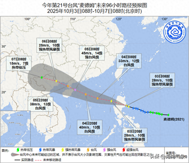 本网站讯(通讯员云蓓李凡)记者上午从海南省气象台了解到,今年第21号台风“麦德姆”已于3日早晨加强为强热带风暴级,今日下午至夜间将移入南海东部海面,强度逐渐增强,最强可达强台风级(14~15级,42~48米/秒),5日白天将在文昌登陆或者近海擦过。受其影响,10月3日下午到5日,南海中部和北部的大部分海域风力逐渐增大到11~13级、阵风14~15级;4日夜间~5日,海南岛北半部地区有强风雨天气,海南岛东部海面、琼州海峡和北部湾北部海面风力11~13级、阵风14~15级;海口、文昌、定安、澄迈、临高、儋州、白沙和昌江等市县累积雨量200~300毫米、局地400毫米。请在南海中部、北部作业的海上平台和船只需迅速做好避风准备,海南岛北半部市县需立即做好台风防御工作,及时转移危险区域人员,做好旅游、交通等管理调度。