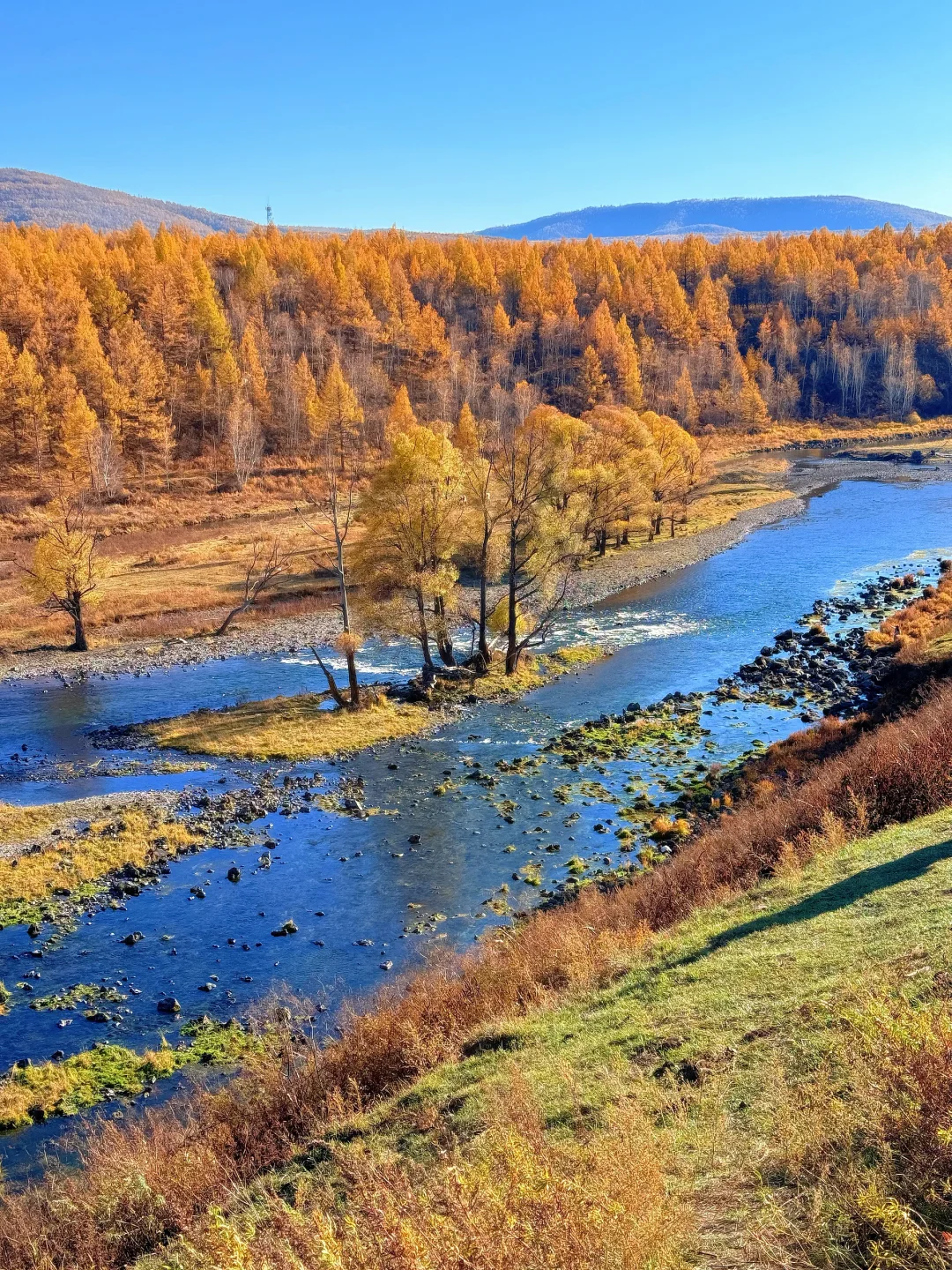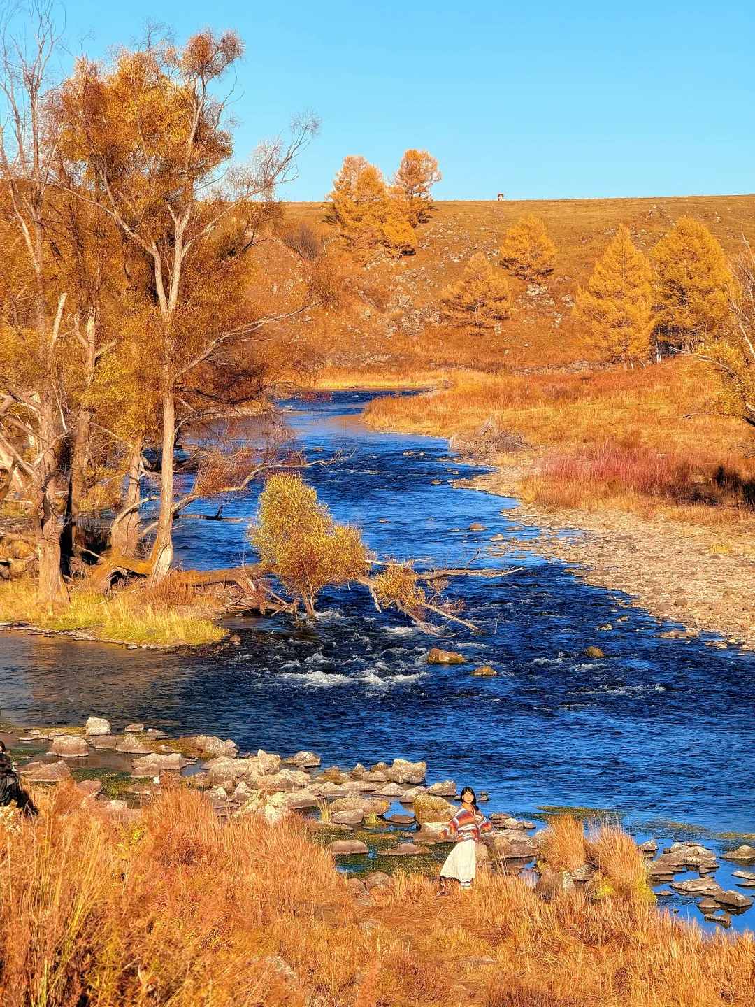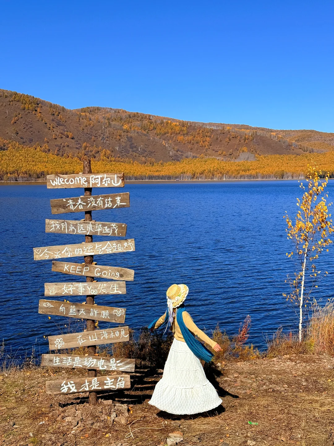 9.27live实拍 - 被《国家地理》评为中国zui美秋色的阿尔山太值了🥹 没来过这里都不敢说真的理解秋天的美 整个世界都是金黄色的 在这样的美景中真的很难不开心😍 看到了不冻河的蓝 过河的牛马🐎 抱到了大大的瑞士卷 这趟旅程真的很满意👍 不用很刻意的去找美景因为处处都是美景🥰 - 👏十一迎来旅游高峰还没有做攻略的小伙伴可以参考我这条线路哦 记得点赞收藏😊 - ✅阿尔山两天一晚游玩路线: Day1️⃣:阿尔山市➖哈拉哈河➖乌苏浪子湖➖网红蓝房子➖天池村➖不冻河 Day2️⃣:阿尔山火车站➖五里泉➖阿尔山森林牧场玫瑰峰➖白朗峰➖返回阿尔山市 - 🍁免费🆓拍照必打卡: 🌊不冻河:随处可见的不冻河,蓝色的水面闪着金光,清晨水面冒着雾气,牛马在水面走过的时候真的太自由了 🏞️乌苏浪子湖:zui佳看晨雾打卡点,我连着去了两次才看到,还有渔船,咖啡车,首图拍照点位就在这里,不夸张的说怎么拍都好看🥹 🏕️网红蓝房子:橘色的世界里多了一个蓝色小屋,格外的可爱,建议爬到山顶从上往下拍,超级好看😍 - 🍁其他值得去的地方: 🌲阿尔山国家森林公园:收费,需要乘坐大巴车上去,人少景美,还有木栈道可以深入林中感受美景 ⛰️白狼峰:日落观赏点位,山顶景色很值得一看 🚞阿尔山火车站:市区必打卡,中国zui小的火车站,一定要来看看哦 🐏阿尔山森林牧场:摸摸小动物就来这里,离市区很近,很适合带小朋友来 🌊五里泉:听说喝完可以长寿😍水无色无味,很多人专门带着桶过来接泉水,可以直接饮用,泉水清凉,水温全年不变 - 🏘️关于住宿吃饭🍚 大部分都是东北菜,难随便进一家味道都还不错 住宿我们选的民宿,老板还给我们煮面吃,真的很暖心 🌟Tips: 1️⃣白色、红色、橘色拍照很出片哦~ 2️⃣昼夜温差大,出门带衣服围巾 3️⃣建议租车自驾,出行很方便🚖 -