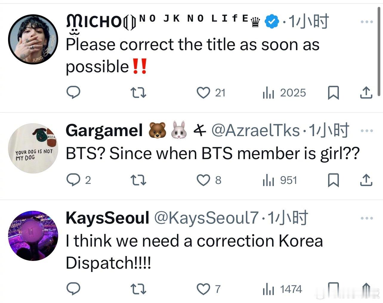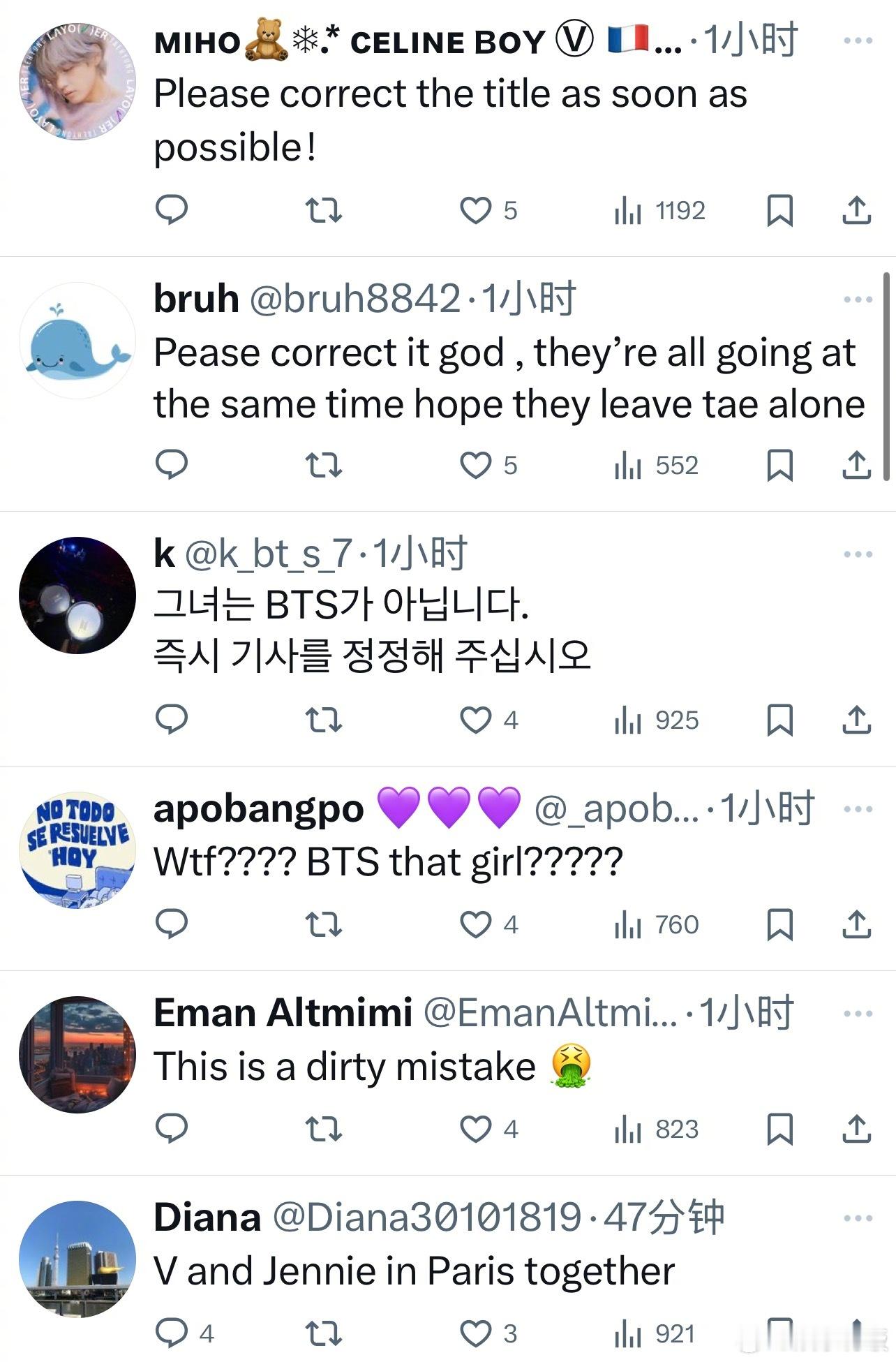 D社把Jennie的组合写成BTS 韩国知名媒体D社在报道Jennie离开机场时写成了“BTS Jennie”,评论区的网友们都在要求修改标题。有网友发现同样的内容在另一社交平台上发布时并没有出现这样的错误。