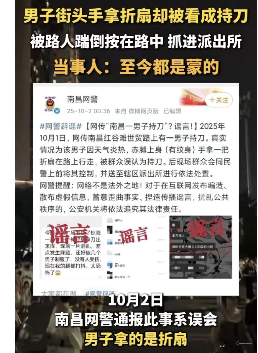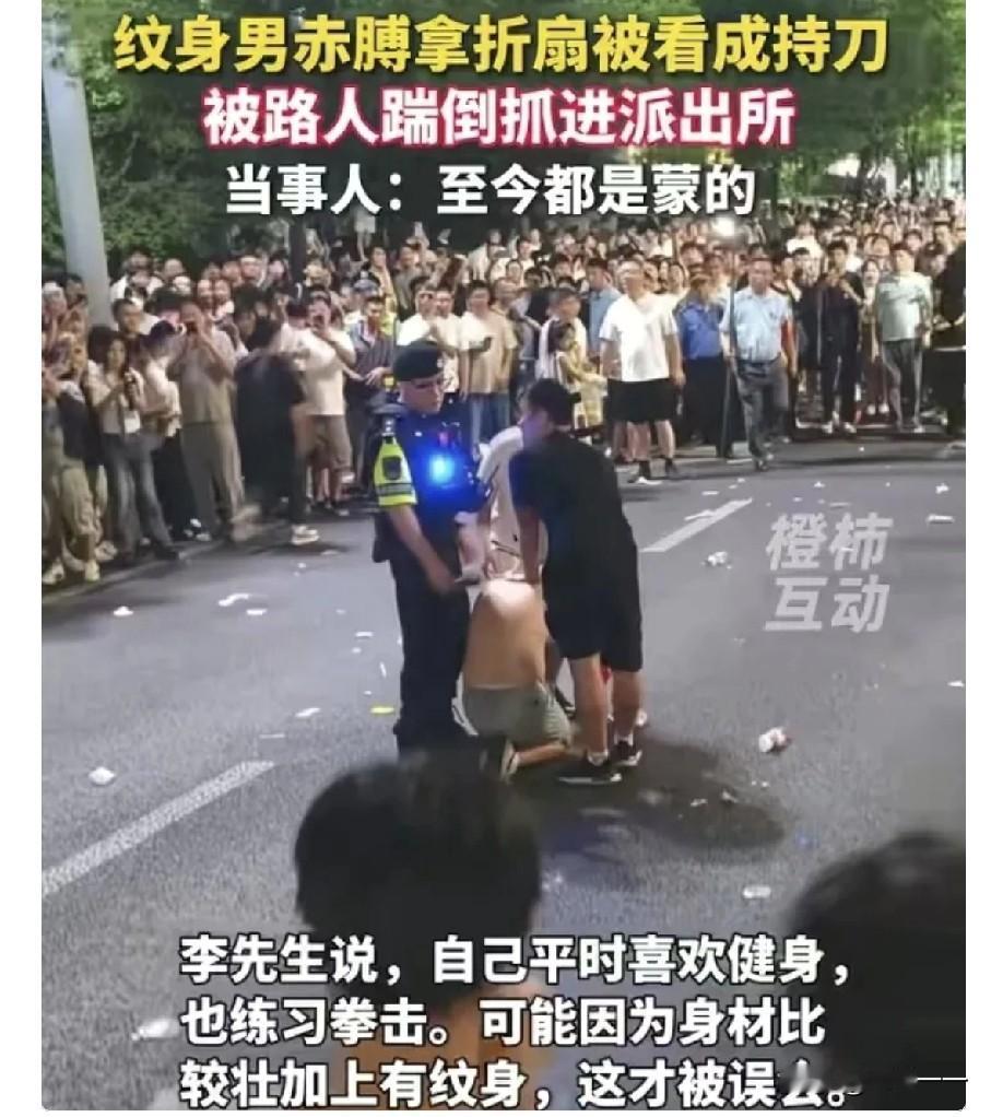 “吃了个哑巴亏[尬笑]”!这是发生在南昌红谷滩世贸路上的一件事!一个纹身的壮硕男子光着膀子拿了个折扇迈着六亲不认的步伐在散步,结果却被人围着狠揍了一顿……男子都委屈的哭了[尬笑]! 原来,在夜晚的路灯忽明忽暗的照耀下,男子为了更凉爽一些,便选择光着膀子,一边还拿了把折扇。 但由于男子长的比较壮硕,背上和手臂上又有纹身,然后手上又拿把折扇(没打开的),在昏黄的路灯照耀下,影子拉得那么长,就那么走过来,还一边大叫外甥的名字…… 纹身、光背、手拿条状物,大喊大叫……所有的buff叠满,远看就像是要当街行凶的坏人。 于是,大街上的热心群众一齐围上来,采取先发制人,对着他就是一顿胖揍后,又给扭送到了派出所。 这一幕也引发了网友的热议。 有的网友说:证明南昌是一个侠义之城,挺有正义感,有满满的安全感! 有的网友说:知人者智,自知者明。光背哥纹身、裸背、手拿不明之物,如此恐怖形象自己却不知,不懂“自知之明”,让群众误解也正常[捂脸]。 有的网友说:唐门36暗器里就有扇子,可以发射暴雨梨花针,不能不防[捂脸]! ………… 【我的点评】: 要我说啊,打完人发现是扇子,让人多尴尬呀[笑哭]! 我认为虽然我不喜欢纹身,但也不能凭借纹身决定一个人的好坏!判断一个人好与坏,主要看他平日的言行和三观正不正,不能仅仅因为有纹身就判定他不是好人。 但一般说来,正义阳光讲原则的人肯定不会去纹身的。 毕竟有句话说得好:纹身不一定是坏人,但好人一定不会纹身。 这件事给所有人上了生动的一课:以后再遇到什么事,一定不能光看表面,得多观察几秒钟。 只是可怜了这个挨打的纹身大哥,可把他委屈坏了,他想不明白,我就上街散个步顺便喊了几句外甥的姓名,怎么就被打了一顿呢?