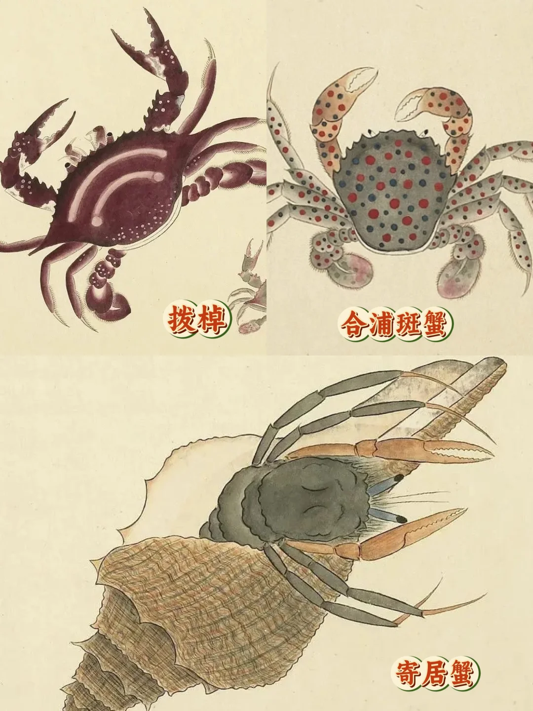 🦑《海错图》中,有80%的生物都能找到对应,比如不同蟹壳的斑点(图6)不同虾类的色泽(图7)不同贝类的纹路(图8)不同鸟类的羽翼(图9)