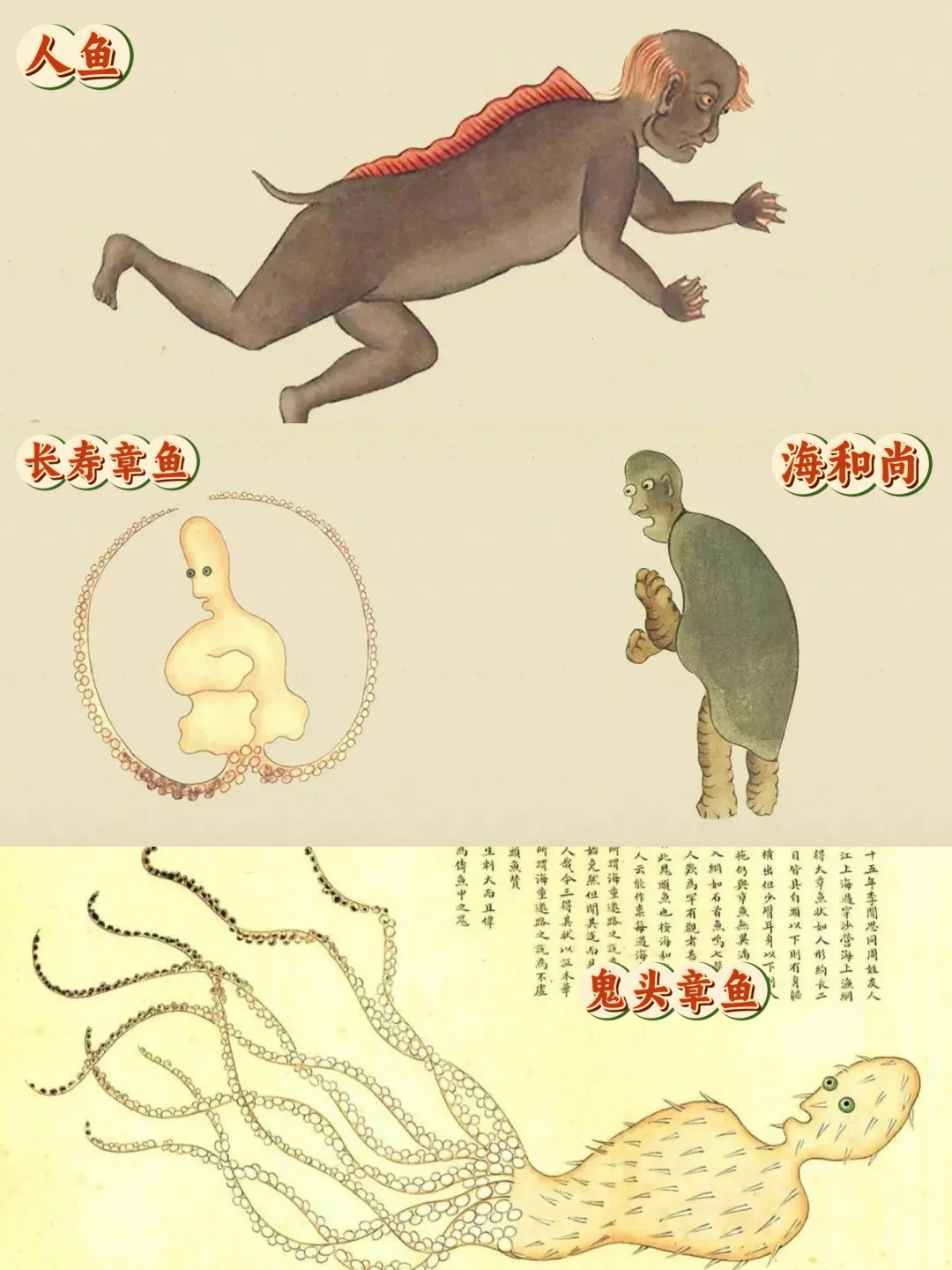 人鱼像一个秃头男子,背上长着红色鱼鳍,长寿章鱼如寿星模样,两只触角做跌坐状,海和尚有着龟身人头,行船人遇见会有不测,鬼头章鱼也是人形,浑身长刺,还能长鸣(图15)