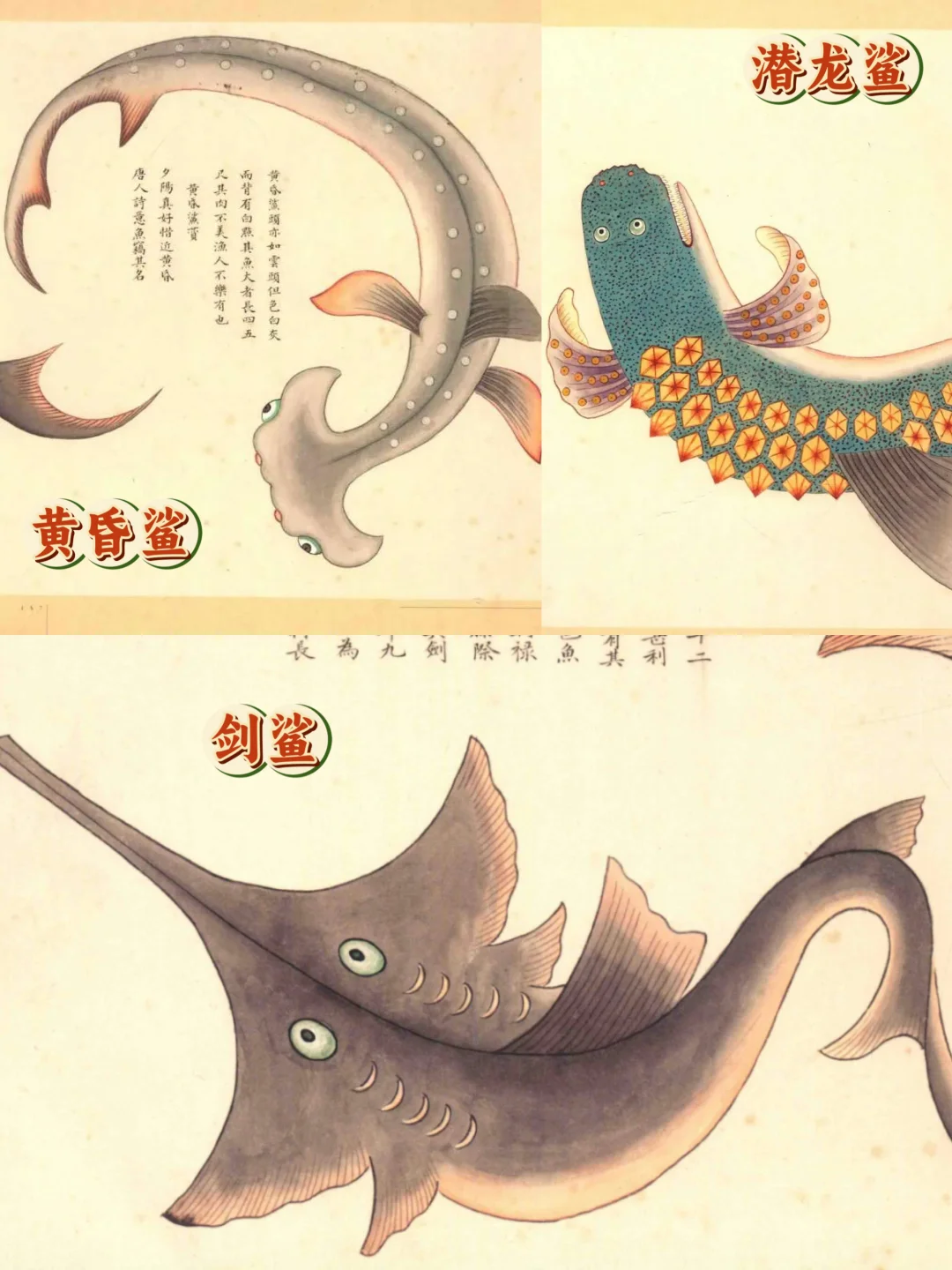该书共有四册,第一册多为鱼类(图3)第二册以鲨鱼为主(图4)第三册记录了海禽、海龟等(图5)以上均收藏于北京故宫博物院,而第四册则多为虾蟹、贝类,收录于台北故宫博物院。