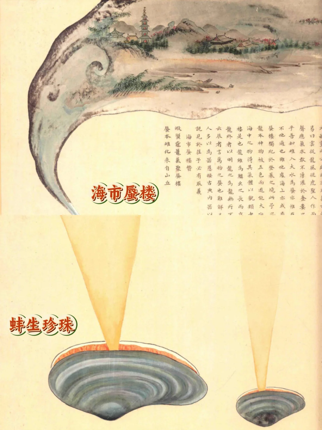 他曾写过在福建菜市场目睹到“翅与尾齐”的文鳐鱼(图10)在黄海、东海一代见闻过数尺长嘴的锯鲨,也曾描绘过鲟虎鱼猎蟹,海市蜃楼、蚌生珍珠等名场面(图11)
