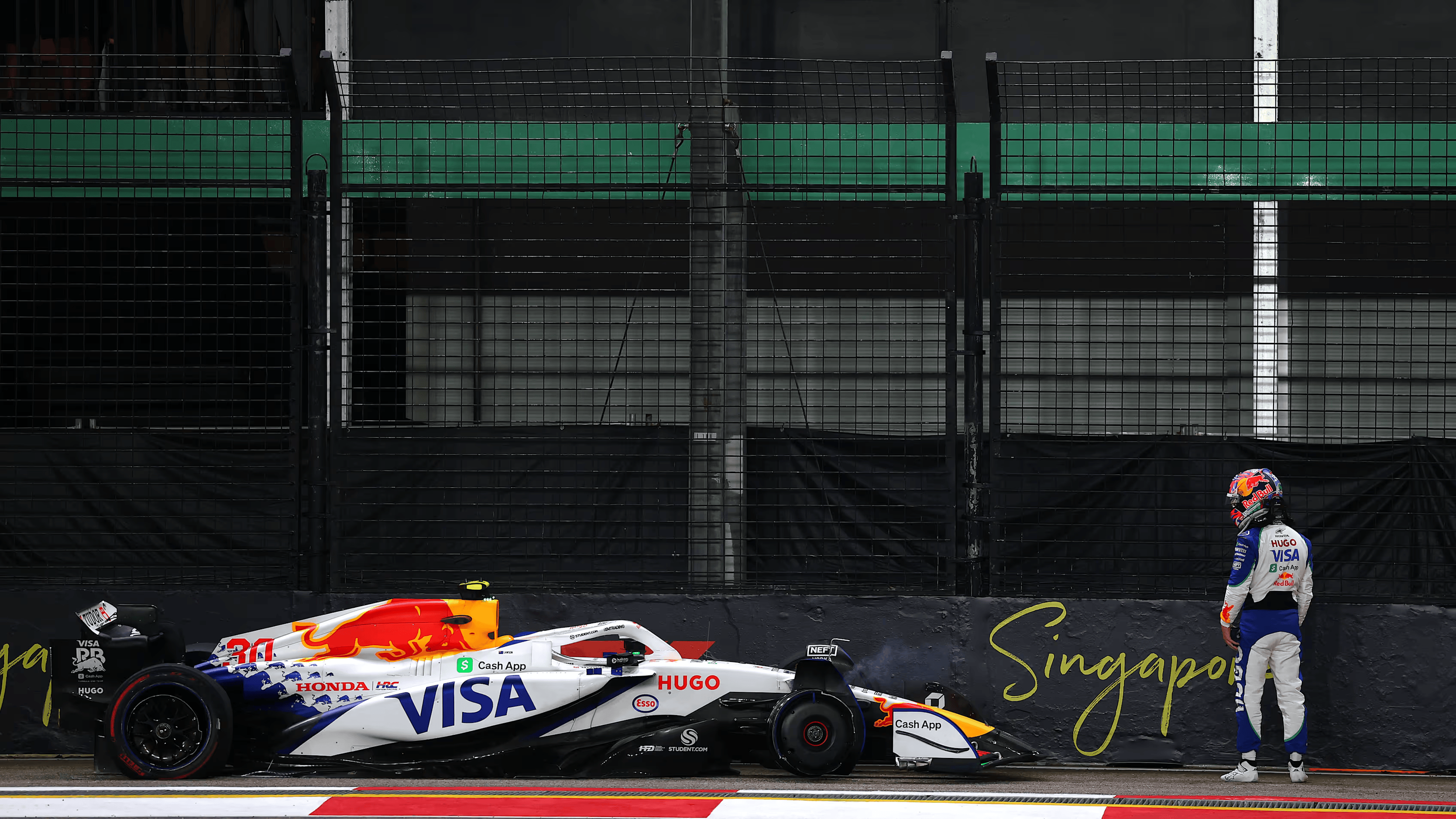 虎扑10月04日讯据F1官方消息,在F1新加坡大奖赛周五练习中,小红牛车手利亚姆-劳森于二练中在17号弯失控撞向护栏,前后轮胎均被刺破,赛车几乎以三轮着地的姿态停在赛道边。这一事故提前终结了他的练习日,也让他错失了在排位赛条件下使用软胎进行实际练习的机会。