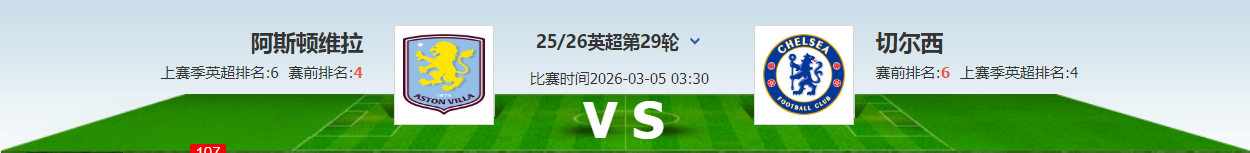 本场比赛是英超第29轮的一场较量,由主场的维拉迎战切尔西。维拉目前取得了15胜6平7负的成绩,积51分排在联赛第四位;切尔西目前取得了12胜9平7负的成绩,积45分排在联赛第6位。