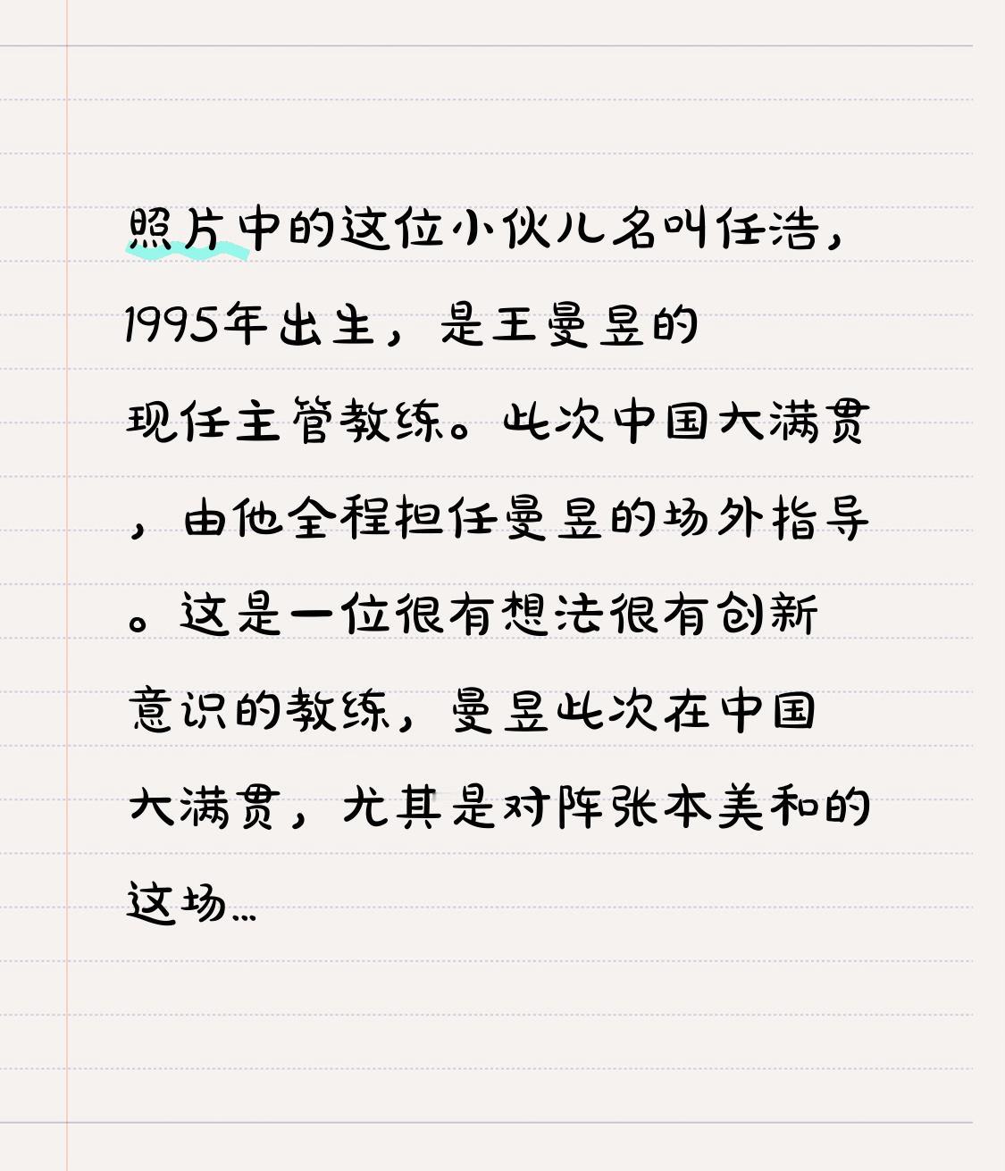 照片中的这位小伙子名叫任浩,出生于1995年,是王曼昱的现任主管教练。在中国大满贯赛事中,他全程担任曼昱的场外指导。这是一位颇具想法与创新意识的教练,曼昱在中国大满贯赛事里,特别是在对阵张本美和的1/4决赛中,打得坚决果断、自信十足,明显有了进步。 许昕在直播时打趣道:“看任浩教练,94年还是95年的,头发这么少,肯定是操心操的。知道我为啥不当教练了吧?太费神啦。” 王曼昱 王曼昱挑战赛 王曼昱反手绝技 王曼昱生图 王曼昱备战实录 国乒曼昱