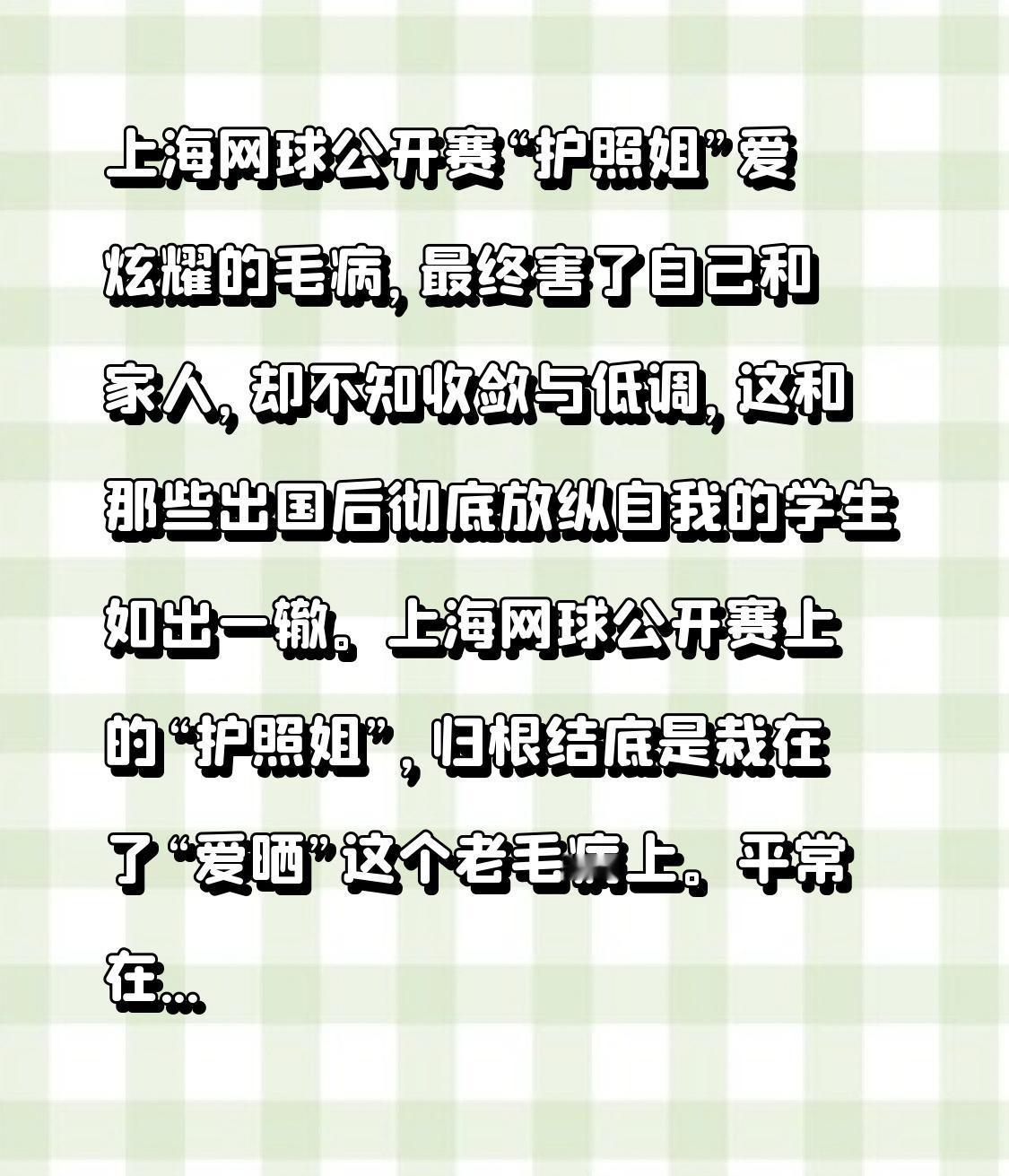 上海网球公开赛“护照姐” 爱炫耀的陋习,终究害了自己与家人,她却不知收敛低调,这和那些出国后便彻底放纵自我的学生毫无二致。 上海网球公开赛上的“护照姐”,说到底是栽在了“爱晒”这一老毛病上。平日里在朋友圈晒提车、晒和老公享用美食、乘坐游艇还不够,看比赛时非得大呼小叫,最后竟掏出外国证件耍威风,纯粹是自找苦吃。 如今早已不是凭借外国证件就能搞特殊的时代了。她在公共场合如此闹事,自己的工作十有八九保不住。 最无辜的当属她老公,好好地上着班,无妄之灾突然降临,却平白无故受牵连,工作都可能受影响。更不用说孩子了,日后在学校难免会被人议论,心理压力得有多大啊? 这事自始至终都怪她爱炫耀、没分寸,最后全家都跟着受影响,实在是不值得。 大家怎么看呢? 上海网球公开赛 上海网球赛 上海网球 网球姐