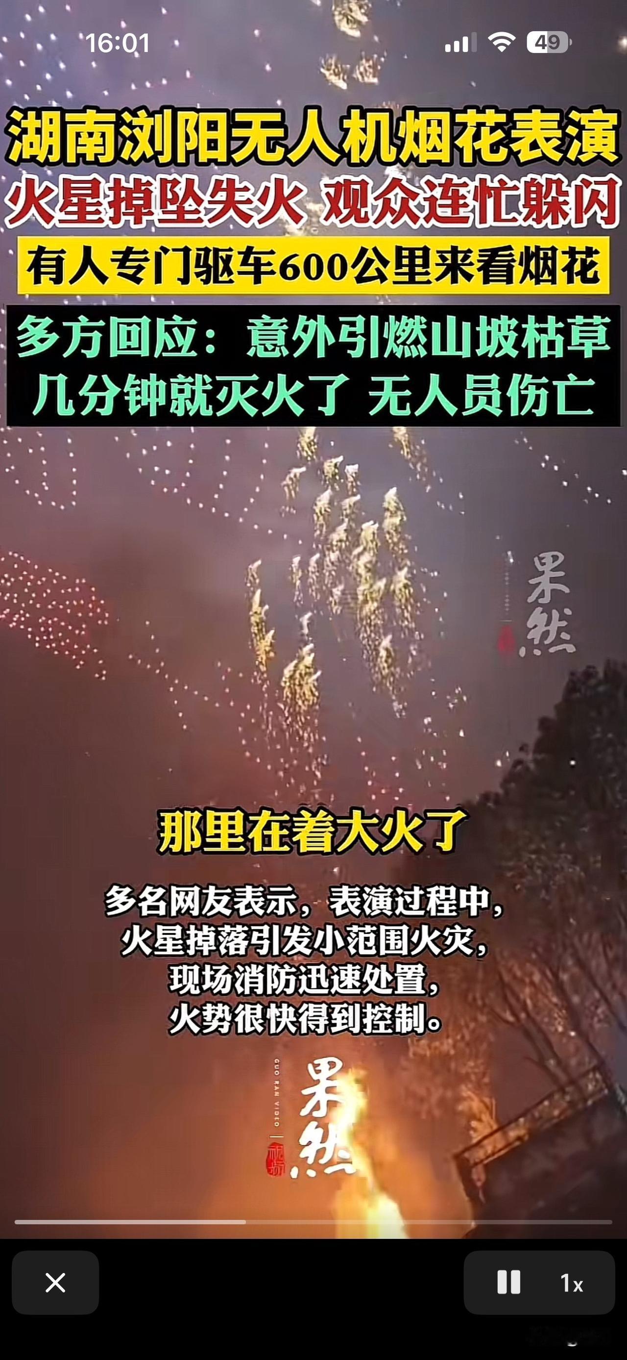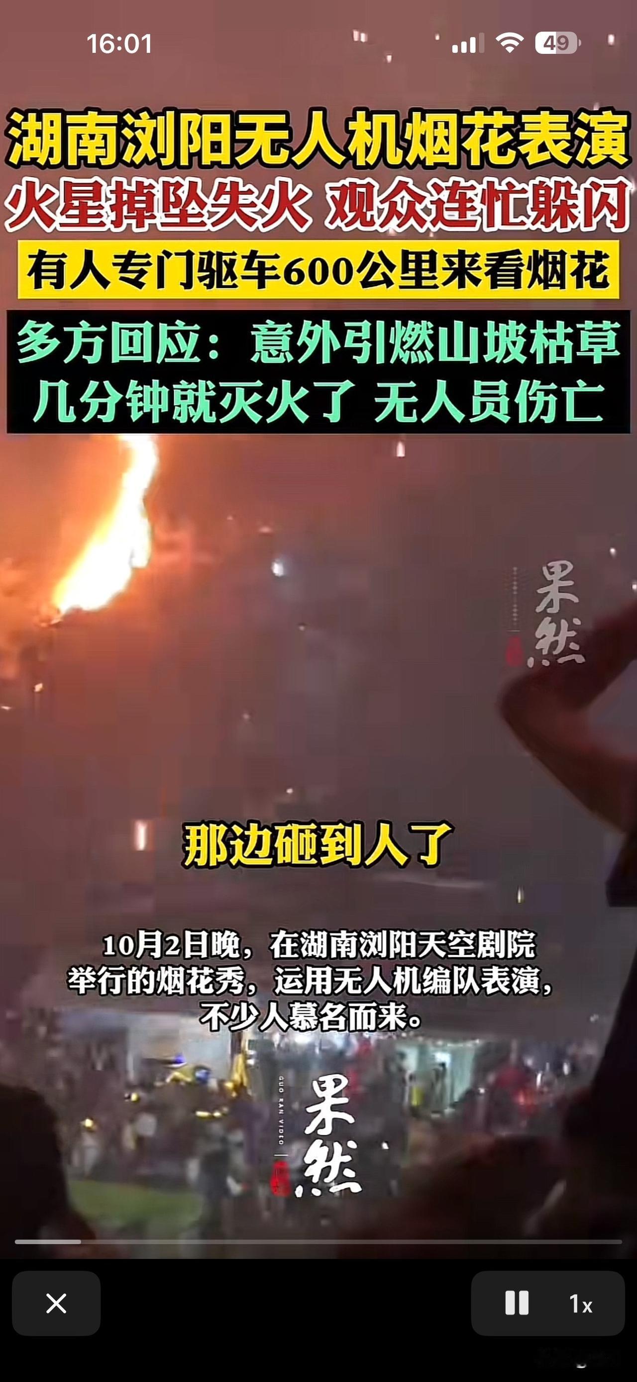 湖南浏阳火星掉坠失火,观众连忙躲闪,有人专门驱车600公里来看烟花。多方回应:意外引燃山坡枯草,几分钟就灭火了🧯无人员伤亡! 此事件发生在10月2日,大家出门旅游,一定要注意健康!针对此事,大家怎么看?