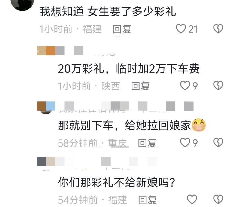陕西新郎想不开的事情,看当地网友的评论据说是因为女方临时要2万的下车礼,但男方暂时拿不出来,因为彩礼已经给了20万左右,再加上婚礼各项开支,男方家应该也是山穷水尽了吧!才情绪崩溃!要不然怎么会想不开转头就跳河了呢? 如果网友说的属实,那这个新娘家算是一辈子心难安!那可是一条生命啊!真正想过日子的,怎么会在大婚之日去为难自己的另一半? 这些习俗在我们常州从未有过,我们常州人彩礼还是让女儿带到婆家,并且,父母还另备嫁妆,一句话,我们这里嫁女儿都是“赔本”的。反正,只有一个孩子,女婿就是半个儿子嘛,今后的一切财产都归女儿女婿。 导致这种状况,女方绝对不会内疚的 最多就是女方把彩礼退回去,再赔男方家点钱,过个若干年,大家都忘了这件事情,她再找一家,再要高额彩礼 对此你怎么看?