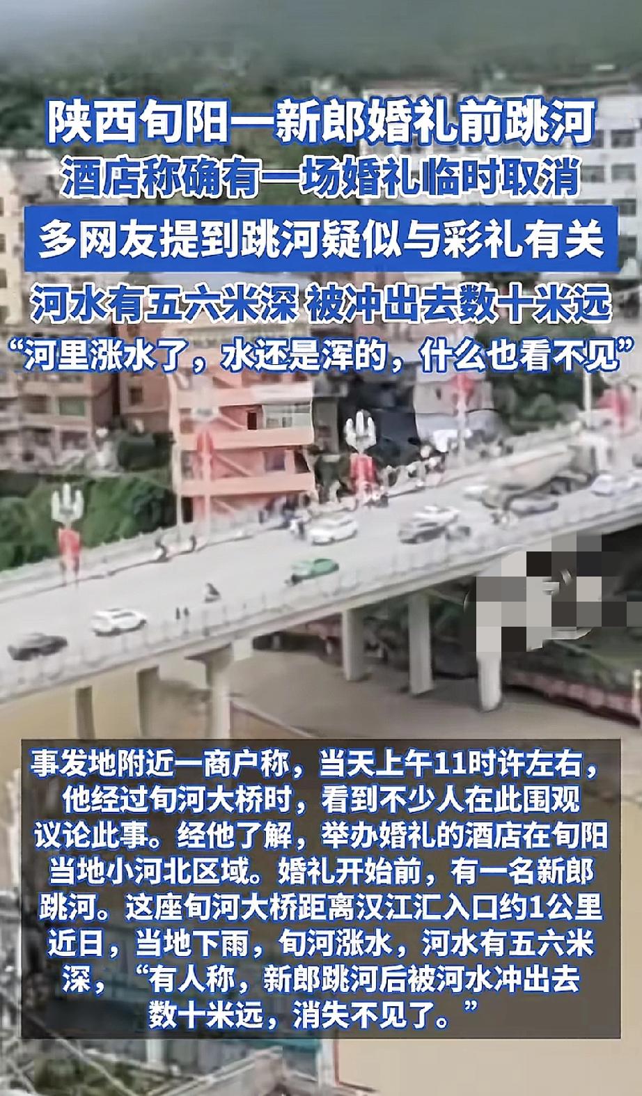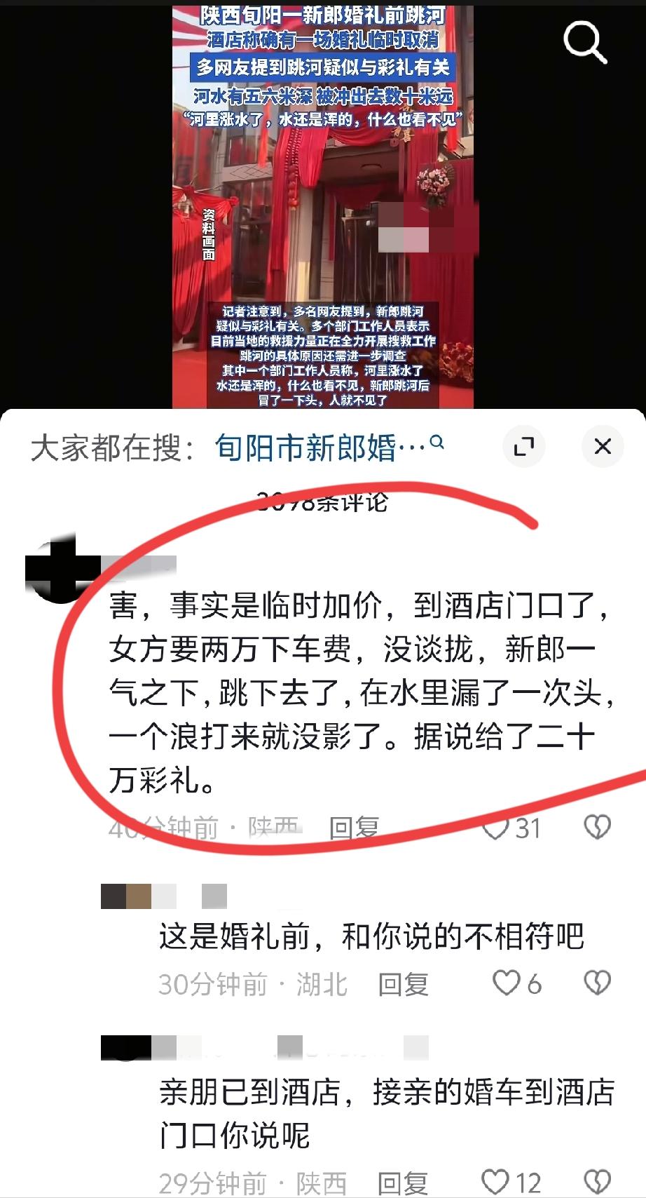 陕西旬阳发生的新郎跳河事件,已真相大白,只因女方临时加三万下车礼。