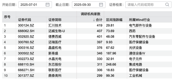 第三季度外资机构调研总次数排名前十情况