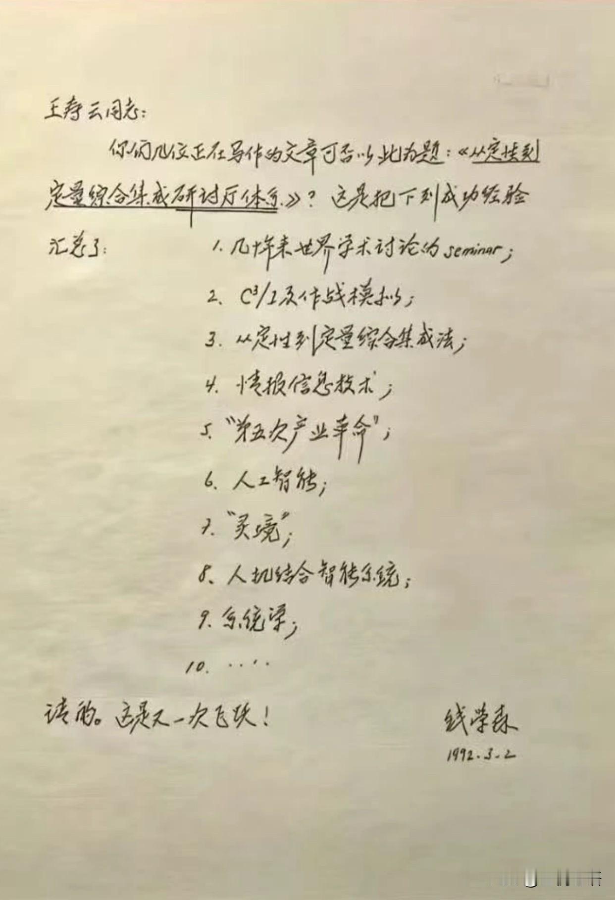 看钱学森笔迹,字里行间全是“稳” 谁看钱学森先生的笔迹不震撼啊! 一笔一画超工整,没有半点潦草。横平竖直像尺子量过,连标点都摆得特别正 五年归国路,十年两弹成! 钱学森这样工工整整地书写着人生, 写就了属于中国人的辉煌! 懂行的人说,这字能看出性格——内核稳得不像话。不管写啥内容,笔锋都不飘,透着股沉下心做事的劲儿。 原来好性格真的会藏在笔迹里。钱老这字,不光是字好看,更是把“踏实”“专注”写进了骨子里,越看越佩服! 最后提的“灵境”就是现在的Ai,人工智能,特别有远见,就是不知道未来会发展成什么样了…… 钱学森 老照片