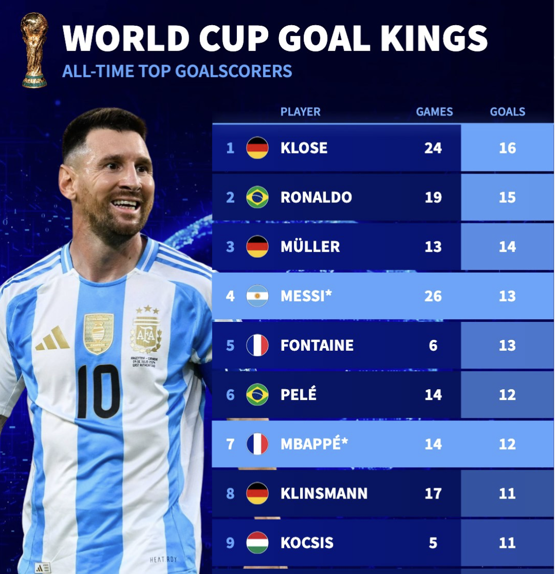 现役球员中,以13球排名第四的梅西和以12球排名第七的姆巴佩都有望继续冲击榜单首位。