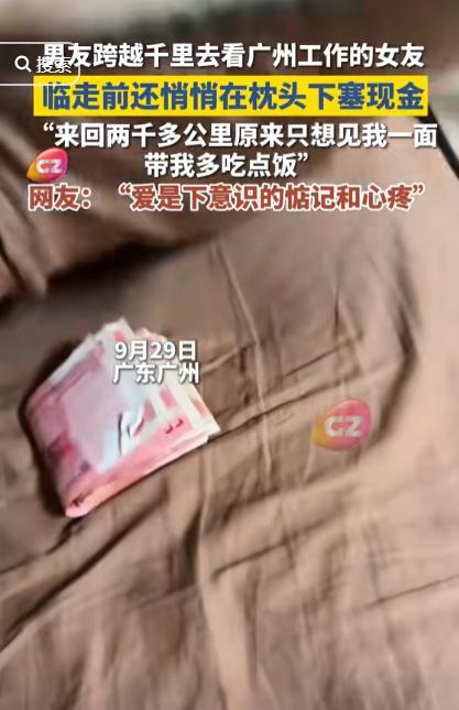 [太阳]9月29日报道,广州,女生和男友温存后,依依不舍送别男友,回家后竟然枕头下看到一沓现金,她瞬间就明白了,这是男友怕自己不要,偷偷给自己留下的,原来2人是异地恋,男友在武汉,2人相距1000多公里,只是为了让她吃好一点,女生一下就崩溃大哭。 (信息来源:广州ing——男友偷偷跑一千多公里来广州看女友,因为心疼女友,提前取好了现金,临走前偷偷塞到了枕头下面。网友:爱你的人总是在为你着想。) 她靠在床头,指腹反复摩挲着枕头下那沓现金,眼泪砸在被褥上。 现金边角被压得平整,半小时前他们还在车站相互告别,现在这沓沉甸甸的钱,替他诉说没说出口的心意...... 从车站回家的时候,她踢掉鞋子往卧室走,发圈不知何时掉在了床上,习惯性地伸手去枕头底下摸索,却触到一片规整的硬实,是一沓现金。 把现金拿在手里,她猛地想起送他出门前的场景,他在房间里磨磨蹭蹭不肯走,嘴里念叨着 “再坐五分钟就好”,原来那时,他是趁她去玄关拿钥匙的空隙,悄悄把钱塞进了枕头底下。 这个傻子,明明知道她的脾气,若是当面给,她定会硬塞回去,还得强撑着嘴硬:“我自己能挣钱,不用你操心。” 可他偏要用这种笨拙的方式,把关心藏在枕头下,像给她留了个专属秘密,等着她发现时,心被瞬间暖化。 现金在掌心渐渐被捂热,记忆却不由自主地回到他来广州的时候。他拎着两大袋零食,行李箱塞得满满当当,全是武汉特产。 来到广州,男友也总是忙着帮她打扫卫生,收拾屋子,帮她把屋子收拾的干干净净的,又陪着她到处拍照打卡。 回去时,他的背包瘪得只剩几件换洗衣物。1000 多公里的高铁,四个多小时的奔波,他只为陪她两天,临走前还惦记着她能不能吃好。 原来那些她刻意隐瞒的窘迫,那些藏在 “挺好的” 背后的委屈,他都悄悄记在了心里。 她眼泪再次涌了上来,如今太多人的爱情,连 “你吃饭了吗” 都成了复制粘贴的问候,可他却能从她一句轻飘飘的 “挺好的” 里,听出她没说出口的不易。 拿起手机翻出两人的合照,照片里他笑得眉眼弯弯,他们之间的故事被传到网上的时候,网友纷纷表示,“这就是爱,要好好珍惜啊。” 真正的在乎,从不是轰轰烈烈的承诺,而是藏在枕头下的现金里,藏在 1000 多公里的高铁奔波里。那些说不出口的关心,都化作细碎的温暖,悄悄落在她的生活里。