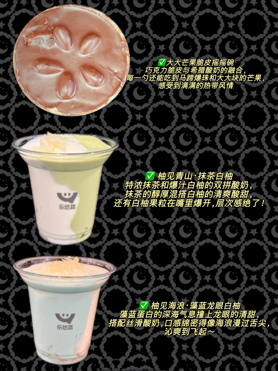 家人们谁懂啊!最近发现的这家「乐悠格」酸奶店,新品鸳鸯酸奶系列也太绝了吧!每一杯都戳中我的味蕾,忍不住来给你们疯狂安利~ ✅ 柚见青山·抹茶白柚 特浓抹茶和爆汁白柚的双拼酸奶,抹茶的醇厚混搭白柚的清爽酸甜,还有白柚果粒在嘴里爆开,层次感绝了! ✅ 柚见海浪·藻蓝龙眼白柚 藻蓝蛋白的深海气息撞上龙眼的清甜,搭配丝滑酸奶,口感绵密得像海浪漫过舌尖,沁爽到飞起~ ✅大大芒果脆皮摇摇碗 巧克力脆皮与希腊酸奶的融合,每一勺还能吃到马蹄爆珠和大大块的芒果,感受到满满的热带风情 而且每杯里面都有5.0you蛋白冷cui希腊云朵酸奶,口感丝滑到犯gui!建yi1小时内冷藏饮用,风味绝绝子~