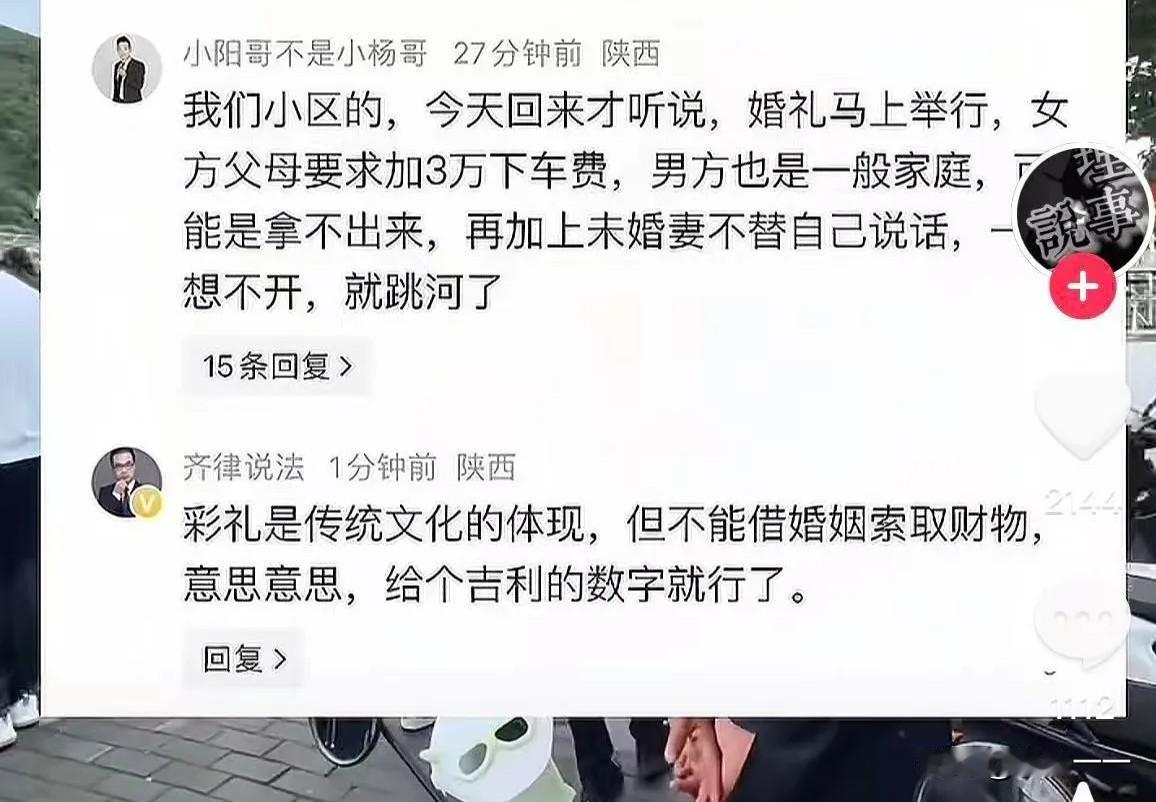 陕西旬阳新郎跳河真相来了,原来远不止追加的2W下车费。 据知情人讲述:新娘家临时追加3W下车礼!我们皖南也是有上车礼、下车礼一说,但是一般都是666或者888元,大家都是图个吉利和喜庆。 不过十里一风俗,不知道为啥这个地方下车礼为什么这么多? 2、据目击者讲述:新郎一气之下跳下去之后,只冒了一下头,就被浑浊的河水冲出十几米远……当时河水很深很冷很浑浊,估计凶多吉少。 3、原本等着新娘一到,婚礼就开始,如今看着布置喜庆的酒店,却找不到当天的主角了。 4、有人说觉得把新娘扔河里都可以理解,想不通为啥自己去跳河呢?大不了退婚呀。 我觉得新郎看到的不仅仅是几万块,看到的是绝望!有了上车礼,可能就有下车礼,就有进门礼,改口礼,洞房礼……,但是跳河不对,退货即可。父母再愁,总比白发人送黑发人强! 这个新郎就是太老实善良胆小,这样的人上头了基本上都是伤害自己。他到底遭遇了什么,要在婚姻当天做出如此举动呢? 但愿有奇迹发生,也希望当地全力搜救。