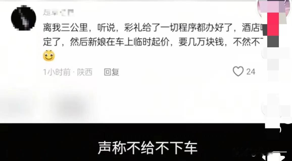 别的地方我不知道,反正我安康几十年,我从来没听说过有什么下车礼这个事,那只是巧立名目,只是为了搞钱而已,如果这个规矩一开,那以后结婚上车礼,下车礼,进门费,改口费,甚至各种各样的费用都来了,这种陋习绝不可以接受,如果我们安康也开始流行,这都是被大环境给污染的。