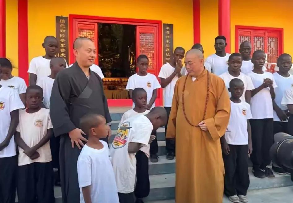 [赞比亚少林寺的中非混血孤儿。] 赞比亚少林寺收养了许多孤儿,这些孤儿中不少是中非混血儿。即父亲是中国人,母亲是非洲人。 这些孩子的中国父亲因为各种原因悄悄地回了国,放弃了自己的混血孩子。而土著母亲又养不起孩子。 正好,赞比亚少林寺在多方寻找这种类型(中非混血)的孤儿,于是孩子的母亲就把这些孤儿送到少林寺寄养。 少林寺就把这些孩子(主要是男孩,因为女孩不方便)都集中起来,学习中文和武术。管他们一日三餐和住宿。 中国博主远航(航哥不平凡人生的亲弟弟)曾担任过这支武术队的教练,他本身就上过武校,且曾是省武术队运动员。远航以俗家弟子身份在赞比亚少林寺执教了一段时间,航哥则经常给这里送钱送物。 后来远航离开了赞比亚少林寺,回去做自己的事业。但他经常回赞比亚少林寺看自己的徒弟们。 (图1为远航回赞比亚少林寺,来看望自己的小徒弟、中非混血儿小初三; 图2为释永信和赞比亚少林寺孤儿武术队在一起。)