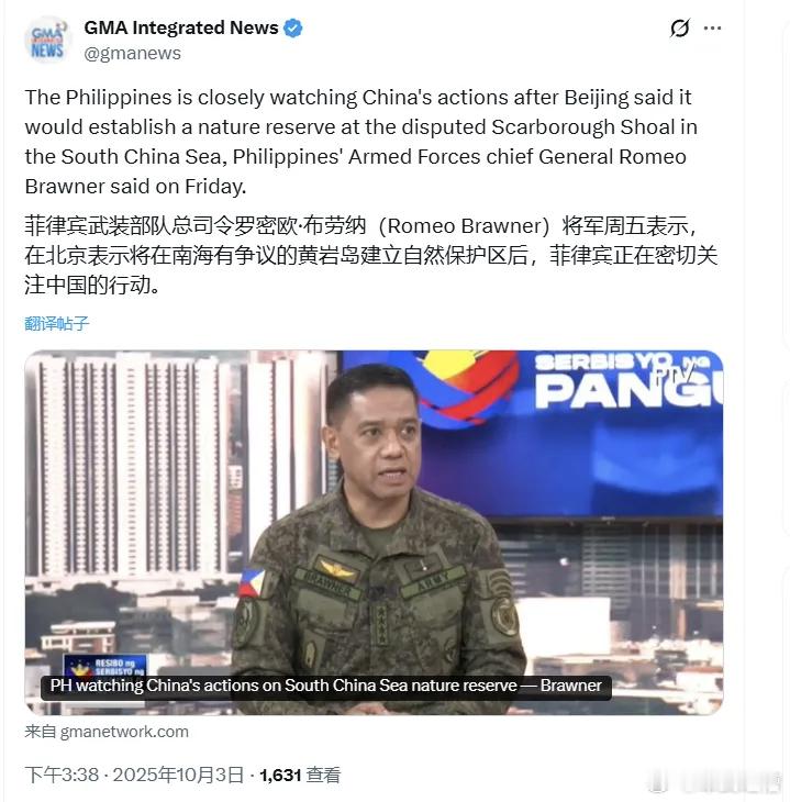 菲律宾军队总司令表示∶绝不允许中国吹填黄岩岛并建设军事基地