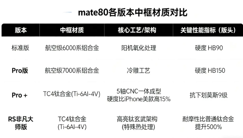 钛合金+玄武架构,华为mate80线下海报疑曝光! 根据目前曝光的信息来看,华为mate80系列在材质上也可谓一骑绝尘,遥遥领先iPhone17!线下海报也疑似曝光! 一、标准版:采用航空级6000系铝合金,硬度达HB90,表面经阳极氧化处理。 二、Pro版:采用航空级7000系铝合金,硬度达HB150,通过冷雕工艺实现金属光泽。 三、Pro+版:采用TC4钛合金,由整块Ti-6AI-4V钛合金经5轴CNC一体成型,硬度比iPhone同款高15%,表面PVD多层高亮镀膜,抗划痕达莫氏9级。 四、RS非凡大师版:同样采用TC4钛合金,但配备“高亮钛玄武架构”,通过特殊热处理形成微米级纹理,耐磨性比普通钛合金提升500%。 这材质绝对抗摔又抗磨啊,大家觉得如何?