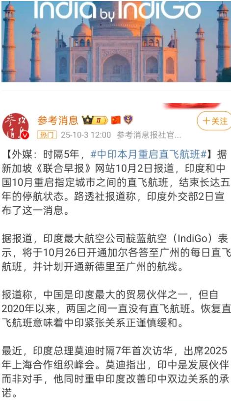 该来的还是要来了!印度加尔各答直飞中国广州的航班将于10月底启动! 等了快五年 中印东部这条直航线终于要复航 不少跑贸易的商人早就在群里传消息 2020年3月疫情爆发 加尔各答到广州直航停飞 之后转机得绕曼谷或新加坡 算上候机要9小时。这次复航的是印度靛蓝航空 每周三、六各一班 10月26日首飞 早上从加尔各答起飞 中午到广州 全程缩到6小时。刚好印度最近推e-K商务签证简化 申请时间从5天变2天 好多做批发生意的印度人盯着这条线 其实加尔各答不是第一次直飞广州 疫情前靛蓝航空就开通过 当时每周四班 主要拉印度商人——广州白云机场旁的三元里、康乐村 好多印度商铺卖的电子产品、服装 都是从这里进货。2023年中印贸易额回升到1320亿美元 广州占了15% 光白云机场中印货运量就比2022年涨30%。复航前印度旅游部做民调 68%印度商人希望恢复这条线 说“省3小时能多谈一笔生意”。还有个细节 加尔各答是印度东部“门户” 连孟加拉吉大港、尼泊尔加德满都 好多东南亚货物先运到这 再转飞广州 直航开了能省不少成本 为什么又是广州?好多人问 其实原因有三: ① 广州是中印贸易“桥头堡”——三元里皮具城、中大布料市场 每天上百名印度商人进货 直航能直接对接需求; ② 白云机场国际枢纽能力——去年国际航班起降12万架次 接得住加尔各答客流 中转国内也方便; ③ 广州印度社群基础——2024年统计有4.2万印度籍居民 大部分做贸易或餐饮 直航开通后他们回家更方便 对普通广州人来说 直航恢复不是“输送印三” 是多了些商机——比如印度商人多了 周边餐馆可能加印度菜 租房市场有需求 做翻译的小生意能火。但要注意签证对等 最近印度e-Tourist visa还没对中国公民开放 中国公民得办纸质签证 这一点得跟上 不然两边往来不公平。还有疫情后人员管理 广州有成熟流程 不用担心乱 有网友调侃“明年龙舟又有三哥女婿了” 这话带点玩笑 但也反映印度人融入广州的印象——之前三元里印度商人跟本地居民相处不错 有的娶了广州媳妇 一起过春节包粽子。更实际的是 直航恢复能让小生意更活 广州老板更快接印度订单 印度商人更省时间进货 我觉得直航恢复是好事 中印都是人口大国 贸易往来得方便点。广州作为枢纽 接住这条线很正常 关键要把签证对等和人员管理做好 让交流更公平。调侃的话听听就行 真论实惠 还是做贸易的小老板和往返的人最开心 这事你怎么看?你觉得直航恢复会给广州带来什么变化?