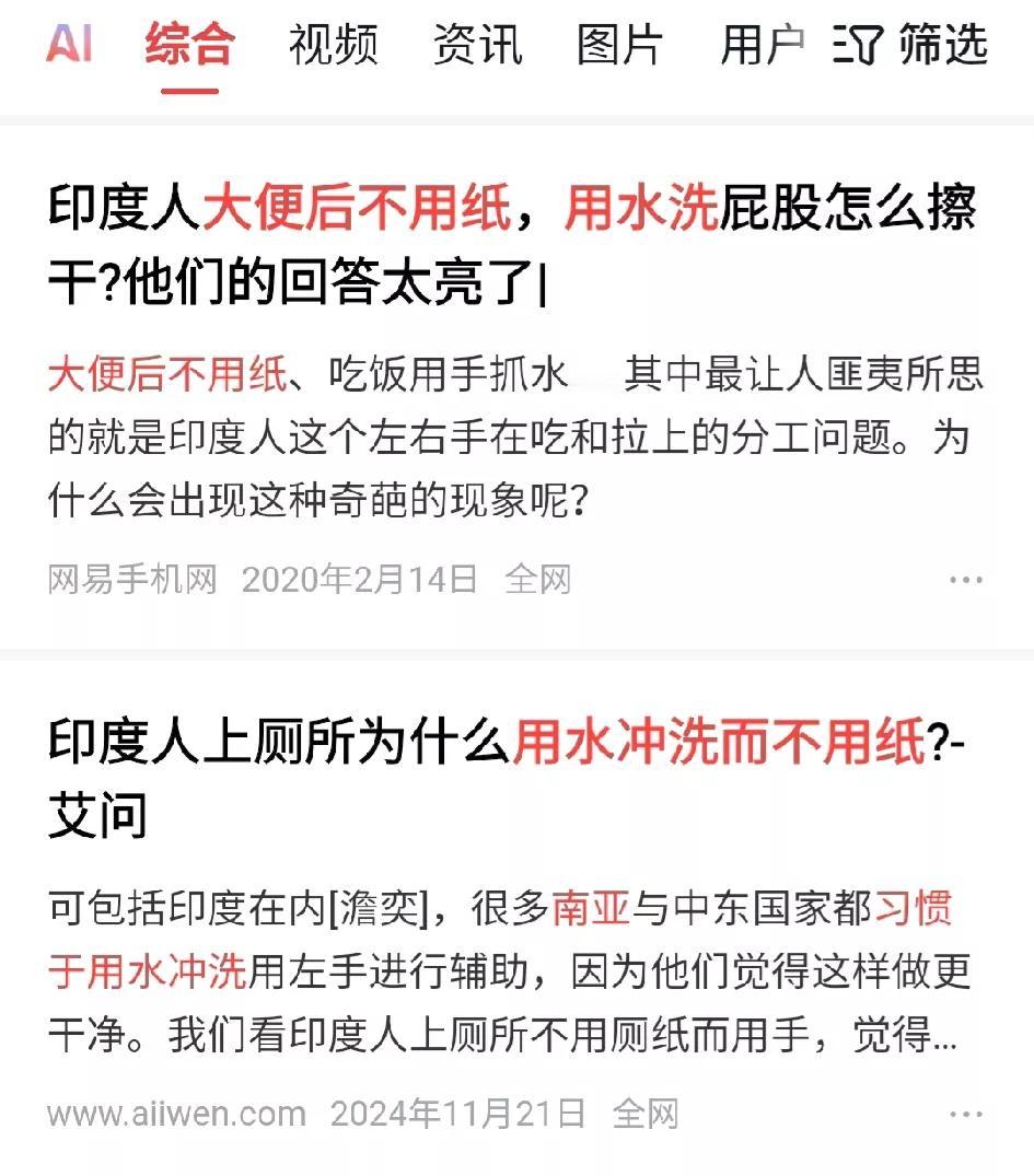 关于几个印度人在北京亮马河洗澡(图1)这事。我说印度人可能会在水底拉"巴巴",可能有人认为我是危言耸听。 这真是事实。 为什么我这样说呢? 记得我有一次听小李(小李环球旅)直播。他说南亚人和中国人不一样,他们出恭后并不用草纸,而是直接用水冲屁股。 我当时不信。结果查了一下资料,这竟然是真的(图2)。 所以印度人在水底出恭,也就不奇怪了。直接用水冲,不用到处找水了,反倒省事。