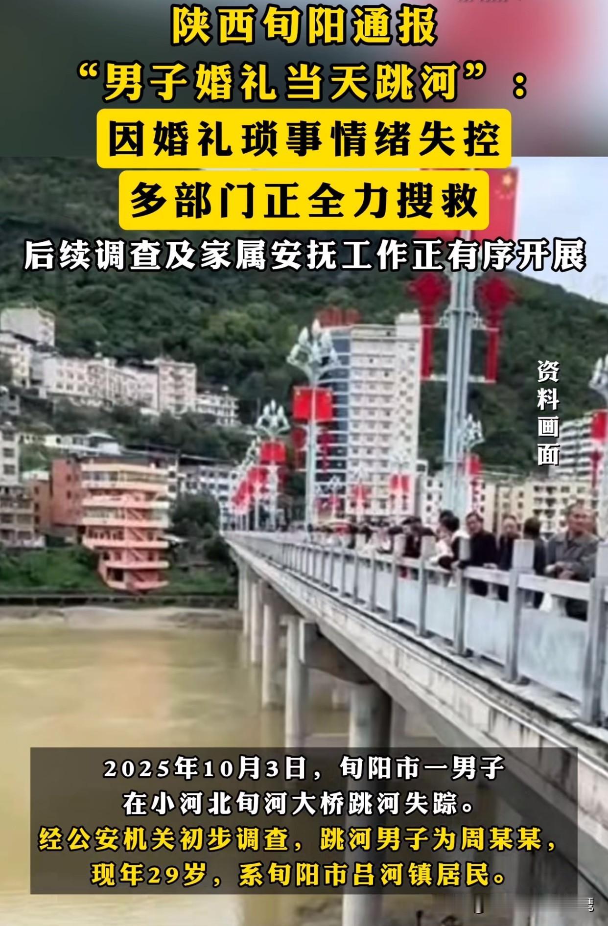 太让人难受了!陕西一29岁小伙子婚礼前,因为彩礼的事想不开跳了河,现在24小时过去了还没找到人。通报里说是“婚礼琐事”,但说实话,大家心里都清楚38万彩礼加5万块的金首饰,女方一分钱陪嫁都没有,这哪是什么琐事?这根本就是要把普通家庭给压垮啊。 “彩礼要得高,往后日子就难过了”,这话听着扎心,却是大实话。我觉得当结婚的祝福变成了生意,小两口从一开始就背上了沉重的经济负担。听说有的老乡为了凑彩礼,连房子和牛都卖了,最后婚没结成钱也要不回来,整个家都垮了。这样的悲剧真的不该再发生了。 说实话,我觉得彩礼早就该回到它原本的意义上来了。结婚不是做买卖,是两个人要在一起好好过日子。咱们这代人真的不能被老规矩给绑住了,幸福不幸福,根本不是用彩礼多少来衡量的。这些老规矩真的不能再拖了,不能再让传统习俗变成害人的东西。 要我说,彩礼应该是让生活更好的东西,不该变成压垮爱情的最后一根稻草。对新人的祝福,从来就不应该用价钱来衡量。