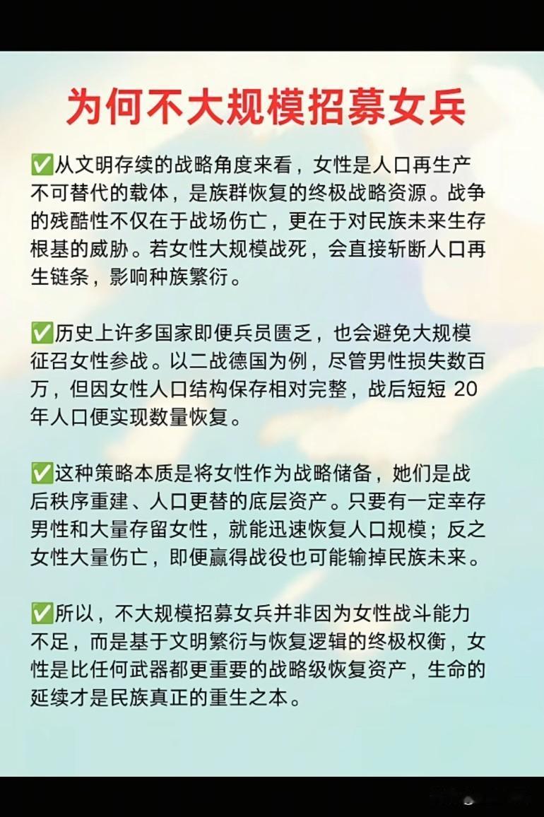 为何不大规模招募女兵? 是因为体能问题吗?战争目的是为了抢夺生存资源 女性都没多少了,就算赢得战争也毫无意义,因为没有未来里养的鸡和鸭,如果杀吃或卖的话,首先杀公的或卖公的,只留一两只公的就可以了,母的一般都舍不得,先留下。战争的根本目的,生育资源,能源,政治资源。男人守疆土,女人守血脉!男兵是希望,女兵是绝望。只有国家到了生死存亡的时刻才会让女人上前线吧