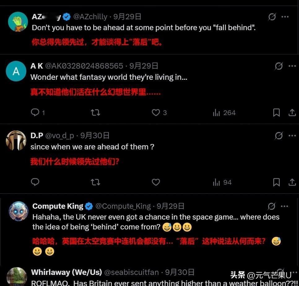 英国被群嘲:昔日帝国连“资格”都没了! 英媒感叹英国在太空军备竞赛中落后中国,结果被国外网友无情调侃:“你得先领先过才谈得上落后!”更有犀利评论戳中痛点:“英国拿什么参赛?”大英帝国的辉煌,似乎早已成为过去,连“上桌”的可能都渺茫了。