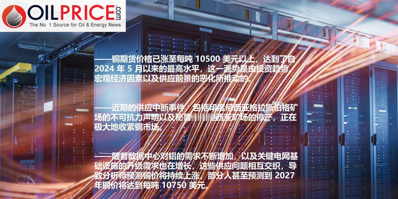 人工智能需求及电网升级推动铜价再度上涨 伦敦金属交易所的铜期货价格突破每吨 10500 美元,创下自 2024 年 5 月以来的最高纪录。这一价格上涨是由多种投资主题、宏观利好因素以及供应前景恶化等因素共同推动的。 弗里波特-麦克莫兰铜金公司公司(FCX)近期在印尼格拉斯伯格矿场(该矿是全球第二大铜矿产地)发布的不可抗力声明,加剧了已经存在的市场混乱局面。再加上来自数据中心和电网升级的不断增长的需求,这种闪闪发光的工业金属似乎有望进一步上涨。 上周,高盛公司的大宗商品专家詹姆斯·麦克吉奥奇将格拉斯伯格矿场事故称为“黑天鹅事件”。 格拉斯伯格矿场事故凸显了铜市场极易受到全球供应冲击的影响,这也是该行业遭遇的最新一次动荡事件。此前,加拿大哈德湾矿业公司上个月曾披露,由于秘鲁康斯坦萨矿场所在地区持续的社会动荡,该公司已决定关闭该矿场的一家加工厂。 工业金属供应短缺的问题与对“下一代AI交易”以及“为美国加油”等主题需求的不断增长相互交织。而最近,高盛还向客户表示,电力网络是“能源安全中的一个薄弱环节”。 换句话说,分析师莉娜·托马斯和达恩·斯特鲁文上周向客户表示:“鉴于AI兴起、地缘政治紧张局势以及向混合战模式的转变等因素,对电网的投资需求——这是能源供应链中的一个薄弱环节——以及由此带来的金属需求增长问题正变得愈发严峻。” 两位分析师均指出,由于人工智能和国防部门将电力网络置于能源安全的核心位置,因此铜成为了新的“石油”。 他们表示:“此类电网升级工程需要大量金属材料:预计到2030年末,电网和电力基础设施将推动全球铜需求增长约 60%,相当于为全球铜需求再增加相当于美国的用量,并为我们在 2027 年实现每吨 10750 美元的铜价预测提供了坚实支撑。”