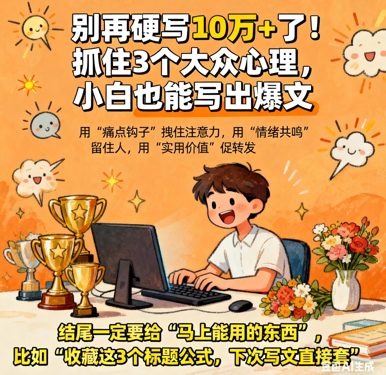 你是不是也有过这种崩溃时刻?熬了3晚写的文章,阅读量连500都不到;明明内容干货拉满,却没人愿意点开看?其实10万+爆文的核心,从来不是文笔多好,而是摸透了大众心理! 首先,用“痛点钩子”拽住注意力。没人会看“如何提升写作能力”,但“写文章没流量?3个方法让你告别0阅读”会让人忍不住点进来——大众永远会为“解决自己的麻烦”停留。 其次,用“情绪共鸣”留住人。别只堆干货,多写“我也曾写废200篇文章,直到发现这个规律”这类真实经历。比起生硬的技巧,读者更愿意相信“和自己一样的人”的经验,共鸣感才是留住阅读的关键。 最后,用“实用价值”促转发。结尾一定要给“马上能用的东西”,比如“收藏这3个标题公式,下次写文直接套”。大众都想做“分享干货的人”,有用的内容才会被主动转发。 其实没有天生的爆款作者,大多是摸透了读者心理的“有心人”。你之前写文遇到过最头疼的问题是什么?是没流量还是写不出内容?评论区聊聊,或许能帮你找到破局思路!
