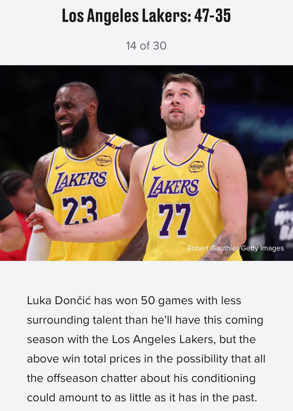 东契奇在身边阵容天赋远不及下赛季洛杉矶湖人队的情况下,就已带队取得过50胜的战绩;但上述预测胜场数已将一种可能性纳入考量——即休赛期所有关于他身体状态的讨论,最终可能会像过去一样,收效甚微。