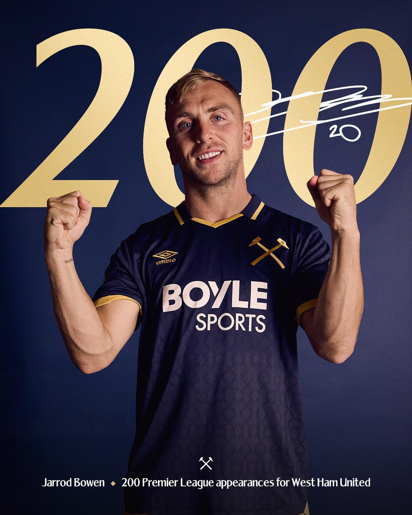 西汉姆联官方:祝贺鲍文达成代表俱乐部第200场英超比赛